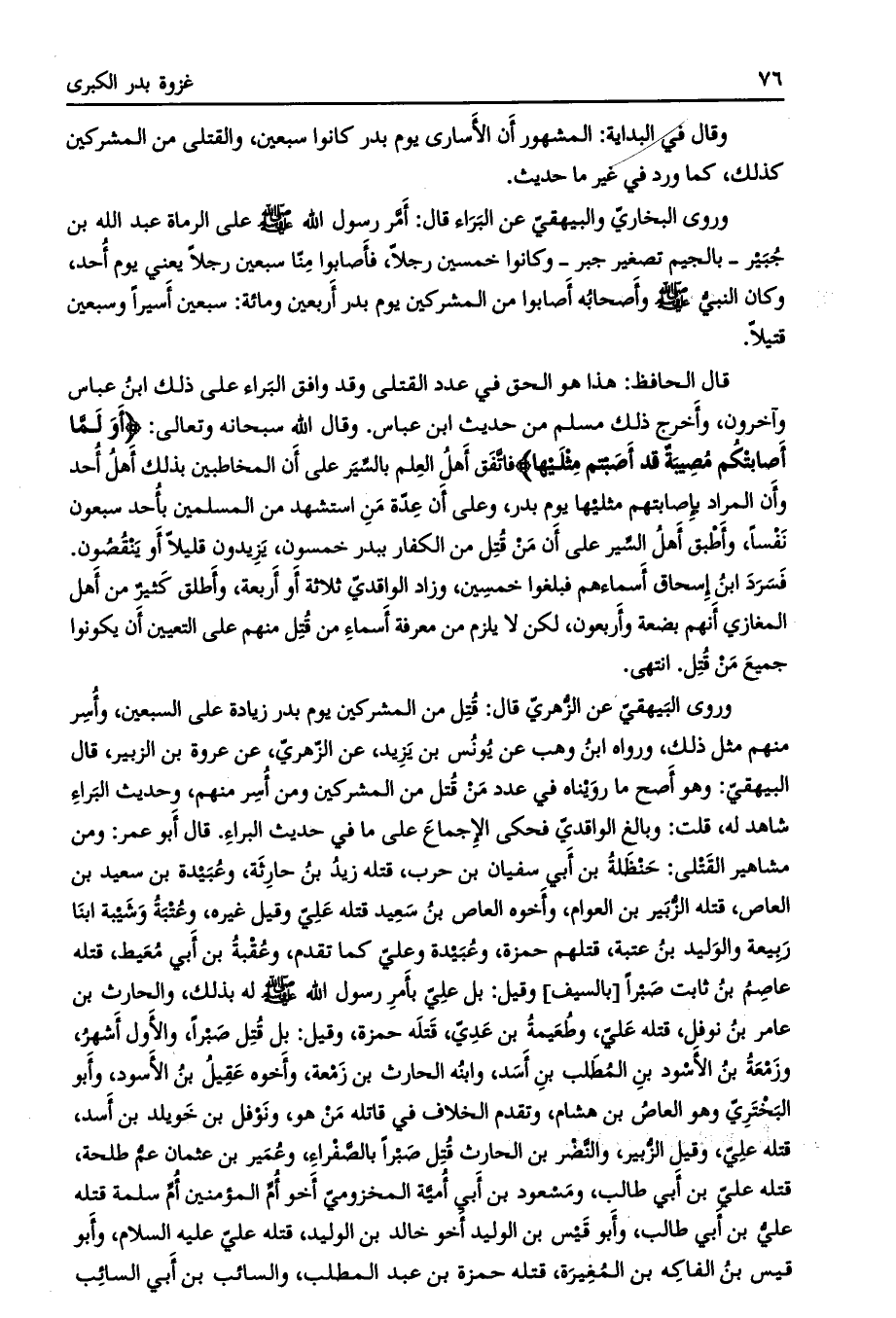 وروى البيهقي عن الزهري قال: قتل من المشركين يوم بدر زيادة على السبعين، وأسر منهم مثل ذلك، ورواه ابن وهب عن يونس بن يزيد، عن الزهري، عن عروة بن الزبير، قال البيهقيّ: وهو أصح ما رويناه في عدد من قتل من المشركين ومن أسر منهم، وحديث البراء شاهد له، قلت: وبالغ الواقديّ فحكى الإجماع على ما في حديث البراء. قال أبو عمر: ومن مشاهير القتلى: حنظلة بن أبي سفيان بن حرب، قتله زيد بن حارثة، وعبيدة بن سعيد بن العاص، قتله الزبير بن العوام، وأخوه العاص بن سعيد قتله عليّ وقيل غيره، وعتبة وشيبة ابنا ربيعة والوليد بن عتبة، قتلهم حمزة، وعبيدة وعليّ كما تقدم، وعقبة بن أبي معيط، قتله عاصم بن ثابت صبرا [بالسيف] وقيل: بل عليّ بأمر رسول الله صلى الله عليه وسلم له بذلك، والحارث بن عامر بن نوفل، قتله عليّ، وطعيمة بن عديّ، قتله حمزة، وقيل: بل قتل صبرا، والأول أشهر، وزمعة بن الأسود بن المطلب بن أسد، وابنه الحارث بن زمعة، وأخوه عقيل بن الأسود، وأبو البختريّ وهو العاص بن هشام، وتقدم الخلاف في قاتله من هو، ونوفل بن خويلد بن أسد، قتله علي، وقيل الزبير، والنّضر بن الحارث قتل صبرا بالصّفراء، وعمير بن عثمان عمّ طلحة، قتله علي بن أبي طالب، ومسعود بن أبي أمية المخزوميّ أخو أم المؤمنين أم سلمة قتله علي بن أبي طالب، وأبو قيس بن الوليد أخو خالد بن الوليد، قتله عليّ عليه السلام، وأبو قيس بن الفاكه بن المغيرة، قتله حمزة بن عبد المطلب، والسائب بن أبي السائب