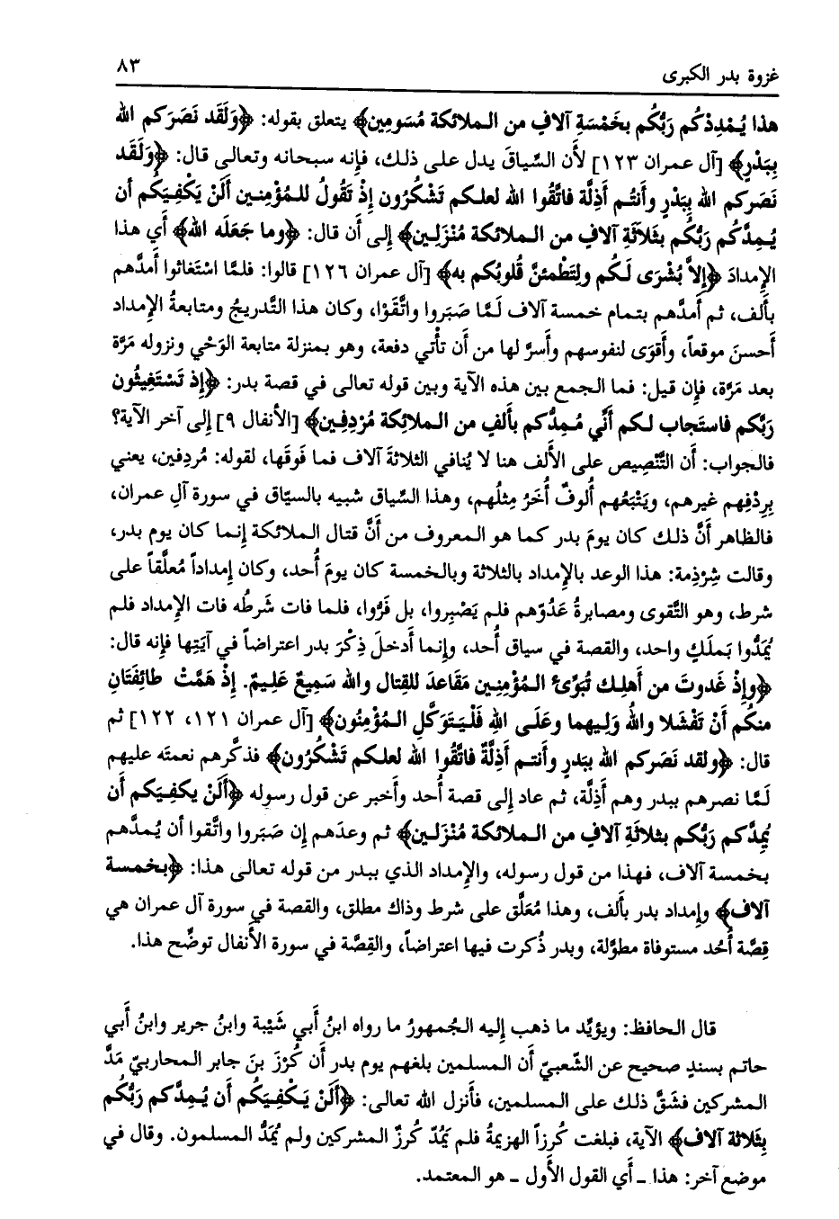 قال الحافظ: ويؤيّد ما ذهب إليه الجمهور ما رواه ابن أبي شيبة وابن جرير وابن أبي حاتم بسند صحيح عن الشّعبيّ أن المسلمين بلغهم يوم بدر أن كرز بن جابر المحاربي مدّ المشركين فشق ذلك على المسلمين، فانزل الله تعالى: أَلَنْ يَكْفِيَكُمْ أَنْ يُمِدَّكُمْ رَبُّكُمْ بِثَلاثَةِ آلافٍ الآية، فبلغت كرزا الهزيمة فلم يمدّ كرز المشركين ولم يمدّ المسلمون. وقال في موضع آخر: هذا- أي القول الأول- هو المعتمد.