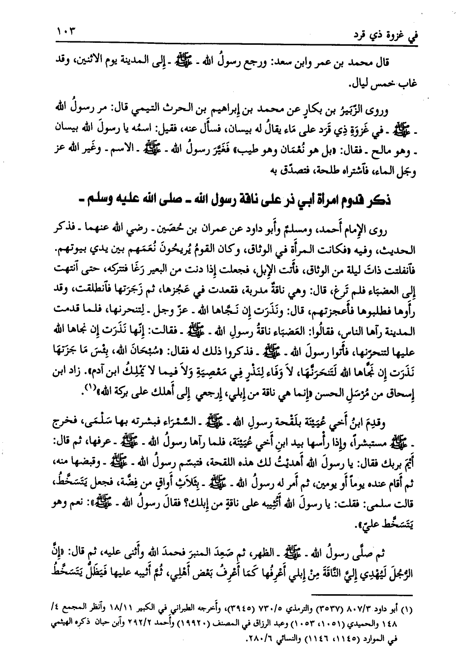فقالت: إنّها نذرت إن نجاها الله عليها لتنحرّنها، فأتوا رسول الله- صلى الله عليه وسلم- فذكروا ذلك له فقال: «سبحان الله، بئس ما جزتها نذرت إن نجّاها الله لتنحرنّها، لا وفاء لنذر في معصية ولا فيما لا يملك ابن آدم» . زاد ابن إسحاق من مرسل الحسن «إنما هي ناقة من إبلي، ارجعي إلى أهلك على بركة الله»