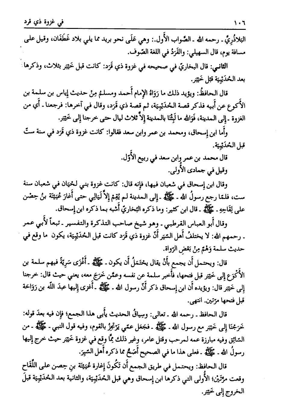 وأما ابن إسحاق، ومحمد بن عمر وابن سعد فقالوا: كانت غزوة ذي قرد في سنة ستّ قبل الحديبية.