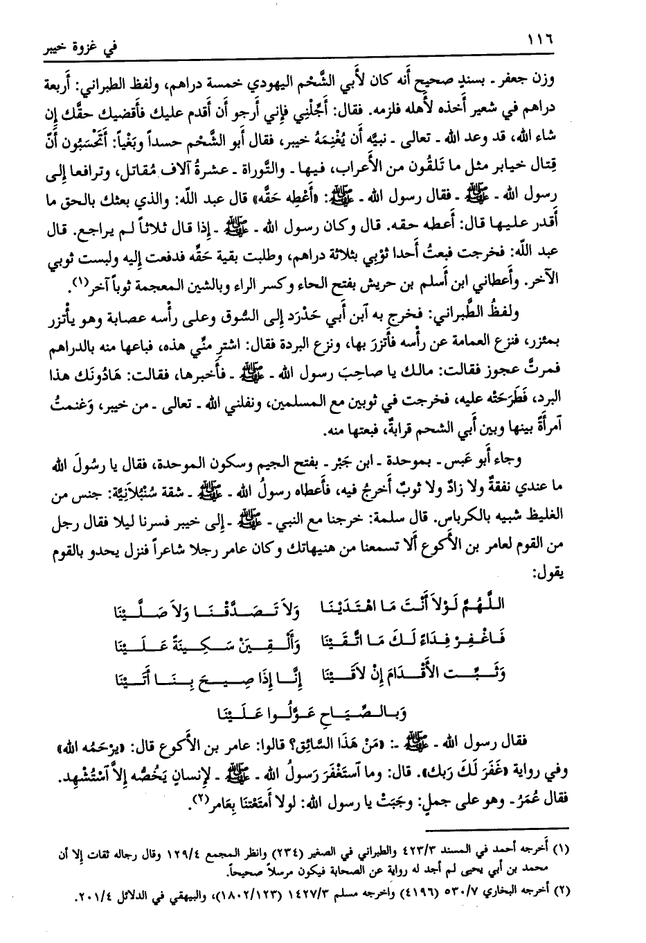وزن جعفر- بسند صحيح أنه كان لأبي الشّحم اليهودي خمسة دراهم، ولفظ الطبراني: أربعة دراهم في شعير أخذه لأهله فلزمه. فقال: أجّلني فإني أرجو أن أقدم عليك فأقضيك حقّك إن شاء الله، قد وعد الله- تعالى- نبيه أن يغنمه خيبر، فقال أبو الشّحم حسدا وبغيا: أتحسبون أنّ قتال خيابر مثل ما تلقون من الأعراب، فيها- والتّوراة- عشرة آلاف مقاتل،