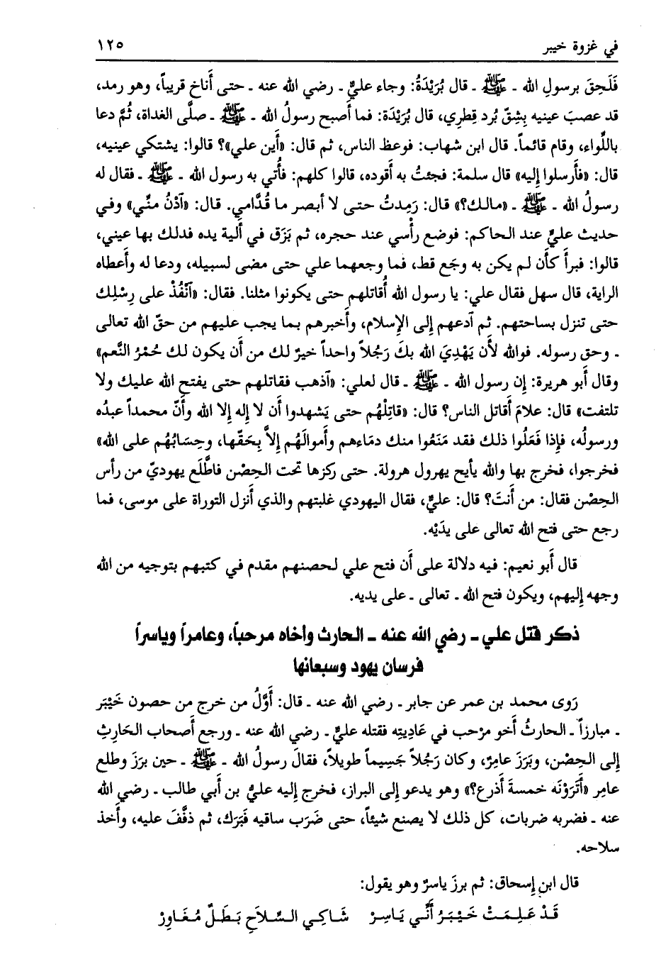 ذكر قتل علي- رضي الله عنه- الحارث وأخاه مرحبا، وعامرا وياسرا فرسان يهود وسبعانها
