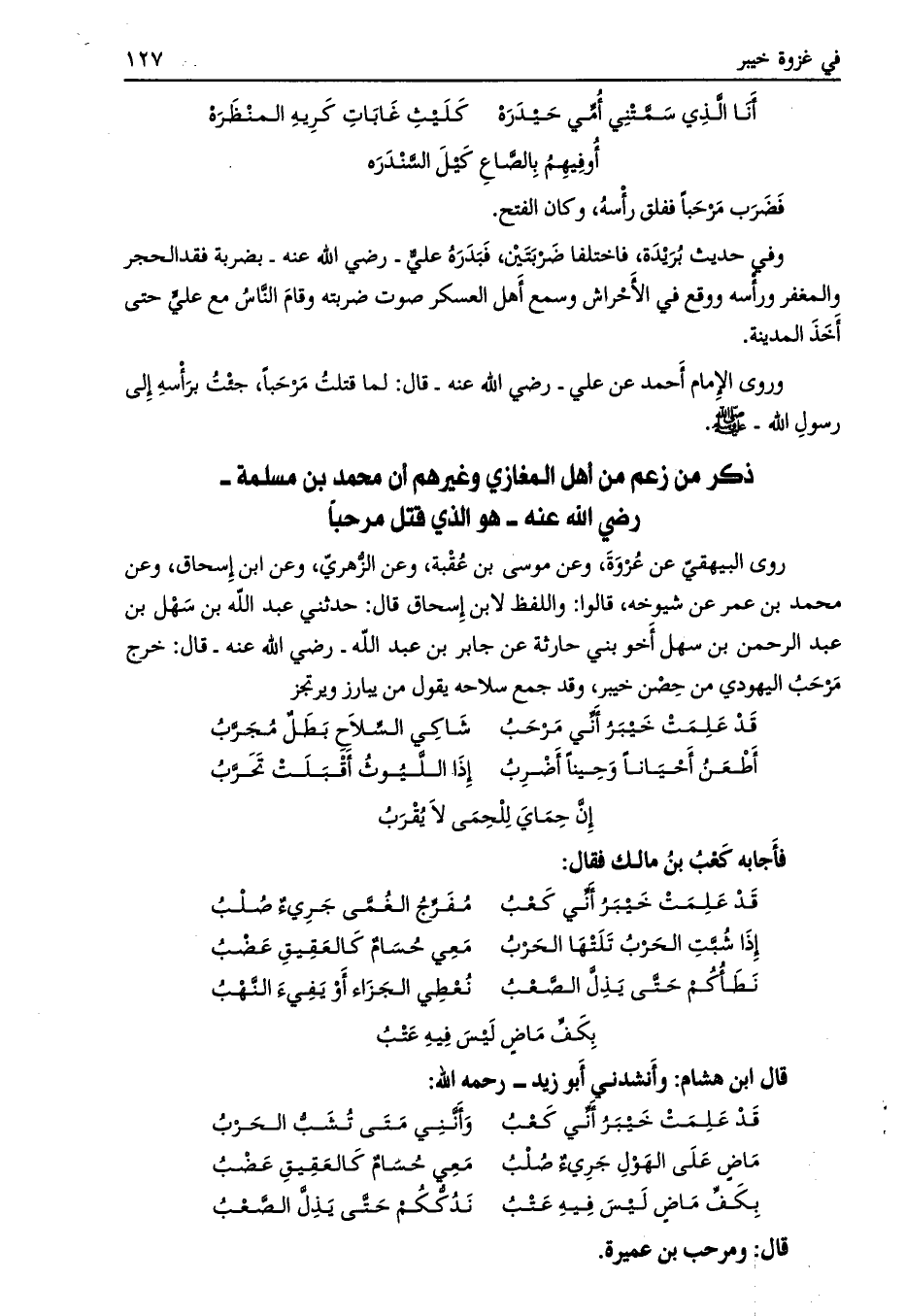 روى البيهقي عن عروة، وعن موسى بن عقبة، وعن الزّهريّ، وعن ابن إسحاق، وعن محمد بن عمر عن شيوخه، قالوا: واللفظ لابن إسحاق قال: حدثني عبد الله بن سهل بن عبد الرحمن بن سهل أخو بني حارثة عن جابر بن عبد الله- رضي الله عنه- قال: خرج مرحب اليهودي من حصن خيبر، وقد جمع سلاحه يقول من يبارز ويرتجز