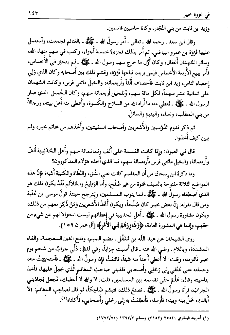 وما ذكره ابن إسحاق من أن المقاسم كانت على الشّق، والنّطاة والكتيبة أشبه، فإنّ هذه المواضع الثلاثة مفتوحة بالسيف عنوة من غير صلح، وأما الوطيح والسّلالم فقد يكون ذلك هو الذي اصطفاه رسول الله- صلى الله عليه وسلم- لما ينوب المسلمين، ويترجح حينئذ قول موسى بن عقبة ومن قال بقوله: إنّ بعض خيبر كان صلحا، ويكون أخذ الأشعريين ومن ذكر معهم من ذلك، ويكون مشاورة رسول الله- صلى الله عليه وسلم- أهل الحديبية في إعطائهم ليست استنزالا لهم عن شيء من حقهم، وإنما هي المشورة العامة، وَشاوِرْهُمْ فِي الْأَمْرِ [آل عمران 159] .