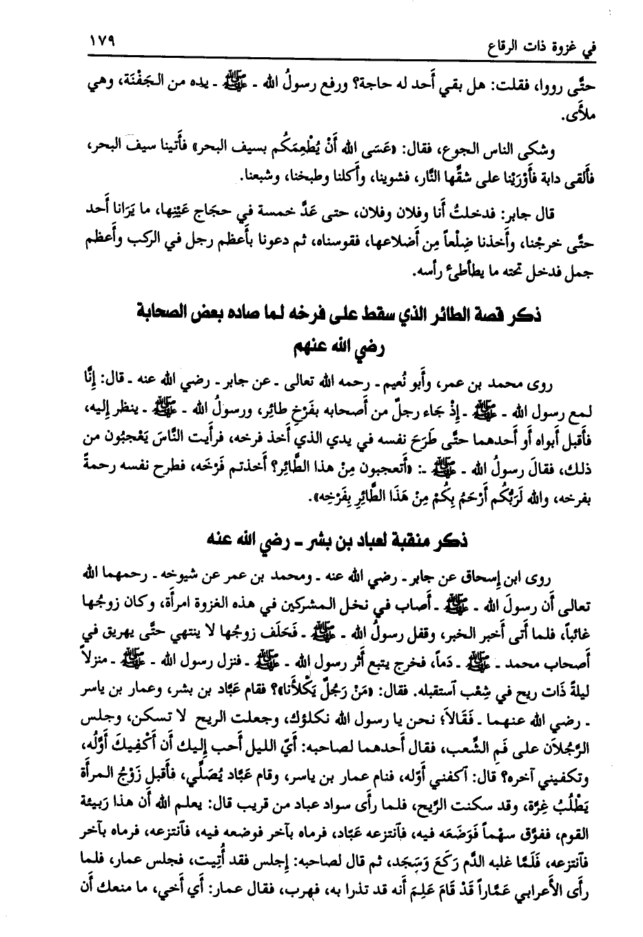 فنزل رسول الله- صلى الله عليه وسلّم- منزلا ليلة ذات ريح في شعب استقبله. فقال: «من رجل يكلأنا» ؟ فقام عباد بن بشر، وعمار بن ياسر- رضي الله عنهما- فقالا، نحن يا رسول الله نكلؤك،