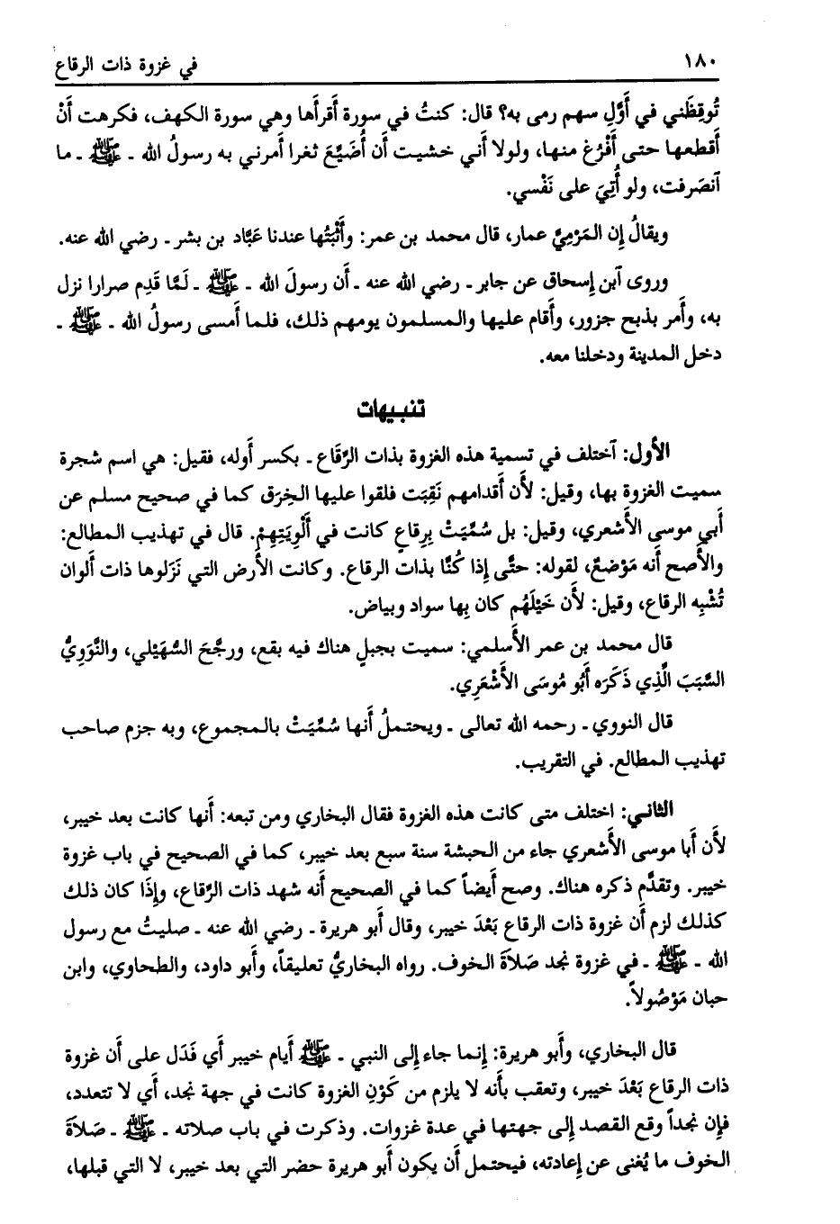 قال البخاري، وأبو هريرة: إنما جاء إلى النبي- صلى الله عليه وسلّم أيام خيبر أي فدل على أن غزوة ذات الرقاع بعد خيبر، وتعقب بأنه لا يلزم من كون الغزوة كانت في جهة نجد، أي لا تتعدد، فإن نجدا وقع القصد إلى جهتها في عدة غزوات. وذكرت في باب صلاته- صلى الله عليه وسلم- صلاة الخوف ما يغنى عن إعادته، فيحتمل أن يكون أبو هريرة حضر التي بعد خيبر، لا التي قبلها،