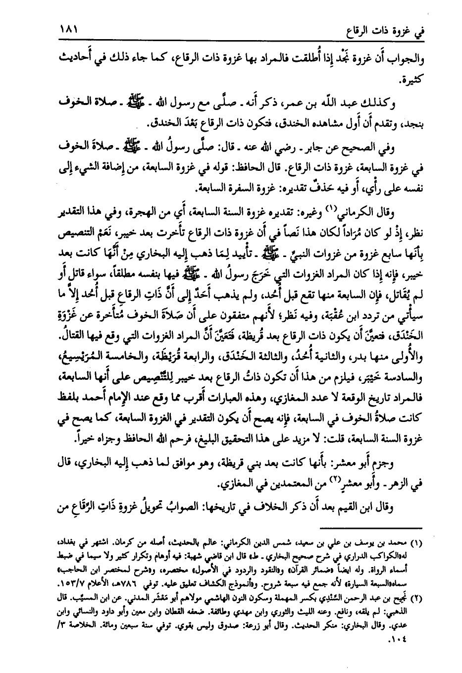 وفي الصحيح عن جابر- رضي الله عنه- قال: صلى رسول الله- صلى الله عليه وسلم- صلاة الخوف في غزوة السابعة، غزوة ذات الرقاع. قال الحافظ: قوله في غزوة السابعة، من إضافة الشيء إلى نفسه على رأي، أو فيه حذف تقديره: غزوة السفرة السابعة.