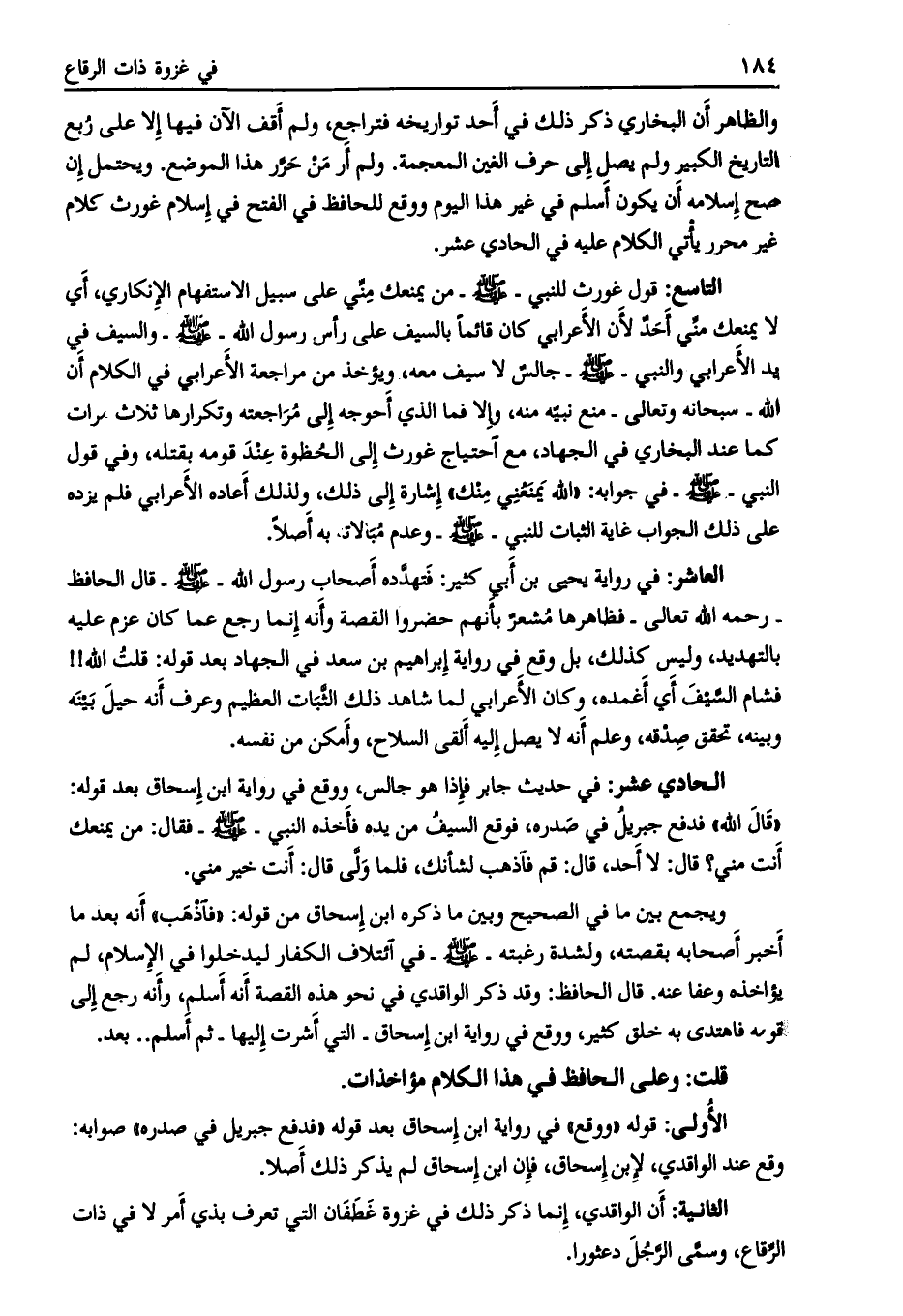 التاسع: قول غورث للنبي- صلى الله عليه وسلم- من يمنعك منّي على سبيل الاستفهام الإنكاري، أي لا يمنعك منّي أحد لأن الأعرابي كان قائما بالسيف على رأس رسول الله- صلى الله عليه وسلّم- والسيف في يد الأعرابي والنبي- صلى الله عليه وسلم- جالس لا سيف معه، ويؤخذ من مراجعة الأعرابي في الكلام أن الله- سبحانه وتعالى- منع نبيّه منه، وإلا فما الذي أحوجه إلى مراجعته وتكرارها ثلاث مرات كما عند البخاري في الجهاد، مع احتياج غورث إلى الحظوة عند قومه بقتله، وفي قول النبي- صلى الله عليه وسلم- في جوابه: «الله يمنعني منك» إشارة إلى ذلك، ولذلك أعاده الأعرابي فلم يزده على ذلك الجواب غاية الثبات للنبي- صلى الله عليه وسلم- وعدم مبالاته به أصلا.