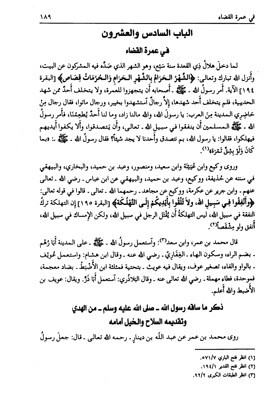لما دخل هلال ذي القعدة سنة سبع، وهو الشهر الذي صده فيه المشركون عن البيت، وأنزل الله تبارك وتعالى: الشَّهْرُ الْحَرامُ بِالشَّهْرِ الْحَرامِ وَالْحُرُماتُ قِصاصٌ [البقرة 194] الآية. أمر رسول الله- صلى الله عليه وسلّم- أصحابه أن يتجهزوا للعمرة، ولا يتخلف أحد ممن شهد الحديبية، فلم يتخلف أحد شهدها، إلّا رجال استشهدوا بخيبر، ورجال ماتوا، فقال رجال من حاضري المدينة من العرب: يا رسول الله، والله مالنا زاد، وما لنا أحد يطعمنا، فأمر رسول الله- صلى الله عليه وسلّم المسلمين أن ينفقوا في سبيل الله- تعالى، وأن يتصدقوا، وألا يكفوا أيديهم فيهلكوا، فقالوا: يا رسول الله، بم نتصدق وأحدنا لا يجد شيئا؟ فقال رسول الله- صلى الله عليه وسلم-: «بما كان ولو بشق تمرة»