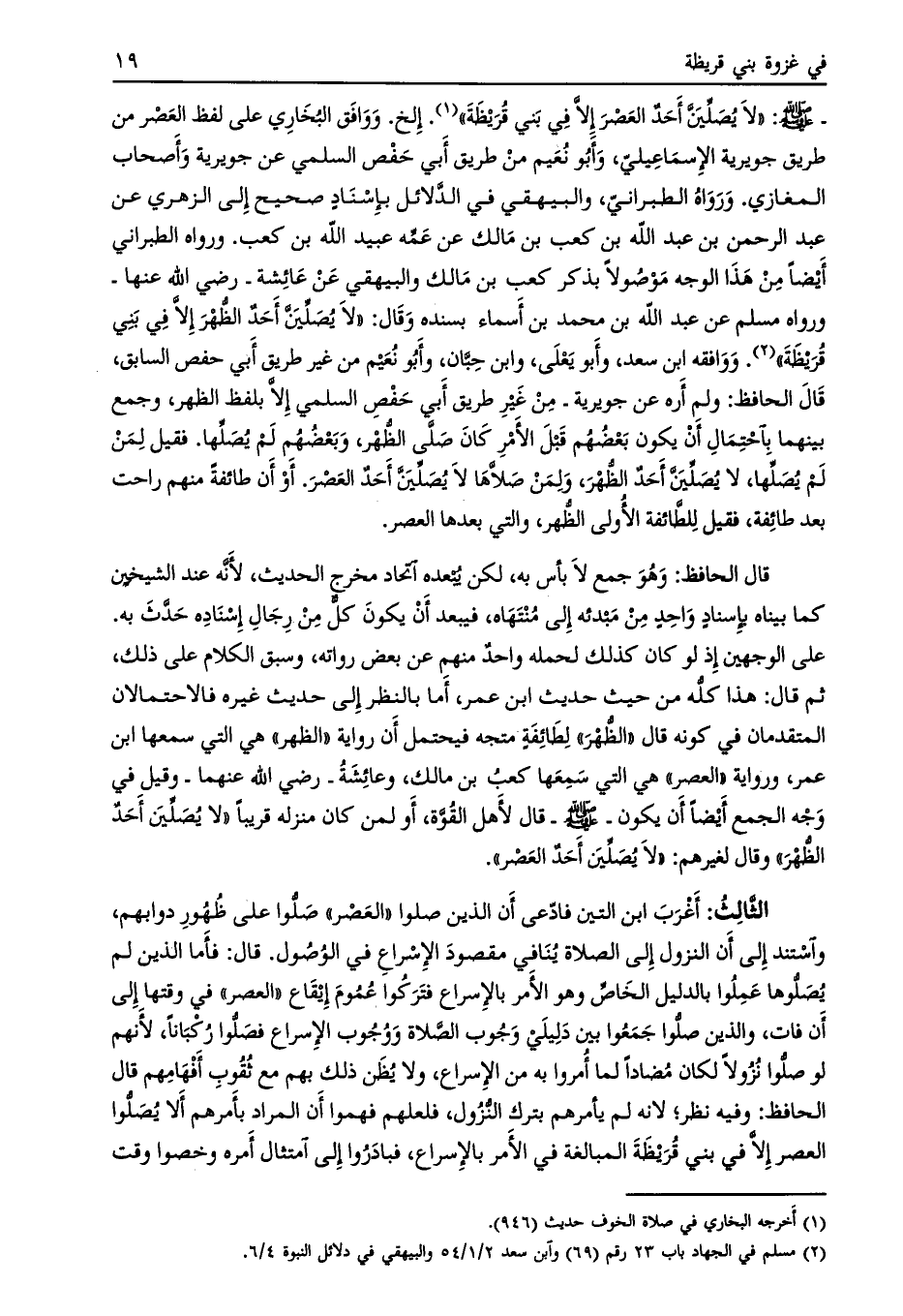 الثّالث: أغرب ابن التين فادّعى أن الذين صلوا «العصر» صلّوا على ظهور دوابهم، واستند إلى أن النزول إلى الصلاة ينافي مقصود الإسراع في الوصول. قال: فأما الذين لم يصلّوها عملوا بالدليل الخاصّ وهو الأمر بالإسراع فتركوا عموم إيقاع «العصر» في وقتها إلى أن فات، والذين صلّوا جمعوا بين دليلي وجوب الصّلاة ووجوب الإسراع فصلّوا ركبانا، لأنهم لو صلّوا نزولا لكان مضادا لما أمروا به من الإسراع، ولا يظن ذلك بهم مع ثقوب أفهامهم قال الحافظ: وفيه نظر، لأنه لم يأمرهم بترك النّزول، فلعلهم فهموا أن المراد بأمرهم ألا يصلّوا العصر إلّا في بني قريظة المبالغة في الأمر بالإسراع، فبادروا إلى امتثال أمره وخصوا وقت