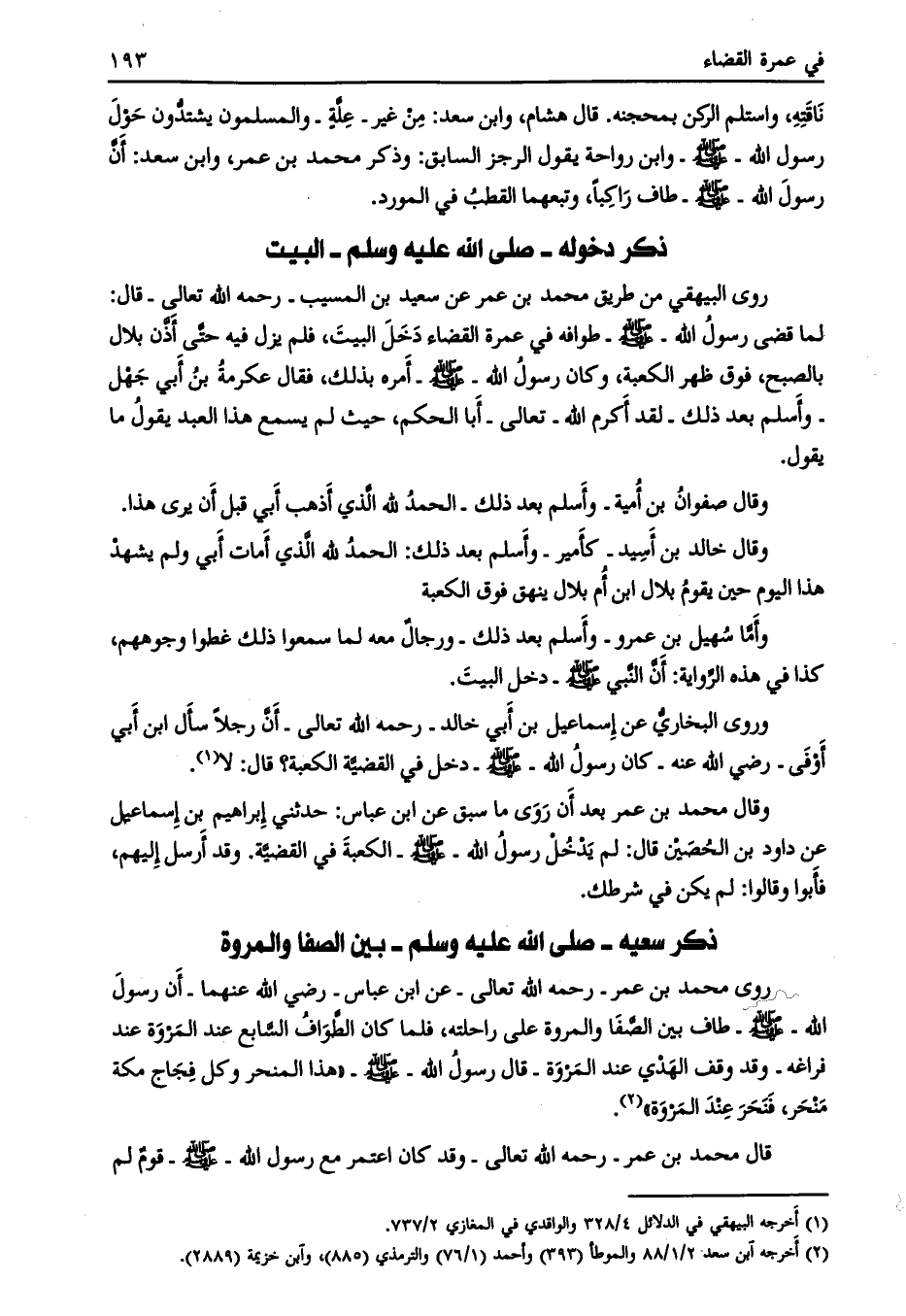ناقته، واستلم الركن بمحجنه. قال هشام، وابن سعد: من غير- علّة- والمسلمون يشتدّون حول رسول الله- صلى الله عليه وسلم- وابن رواحة يقول الرجز السابق: وذكر محمد بن عمر، وابن سعد: أن رسول الله- صلى الله عليه وسلم- طاف راكبا، وتبعهما القطب في المورد.