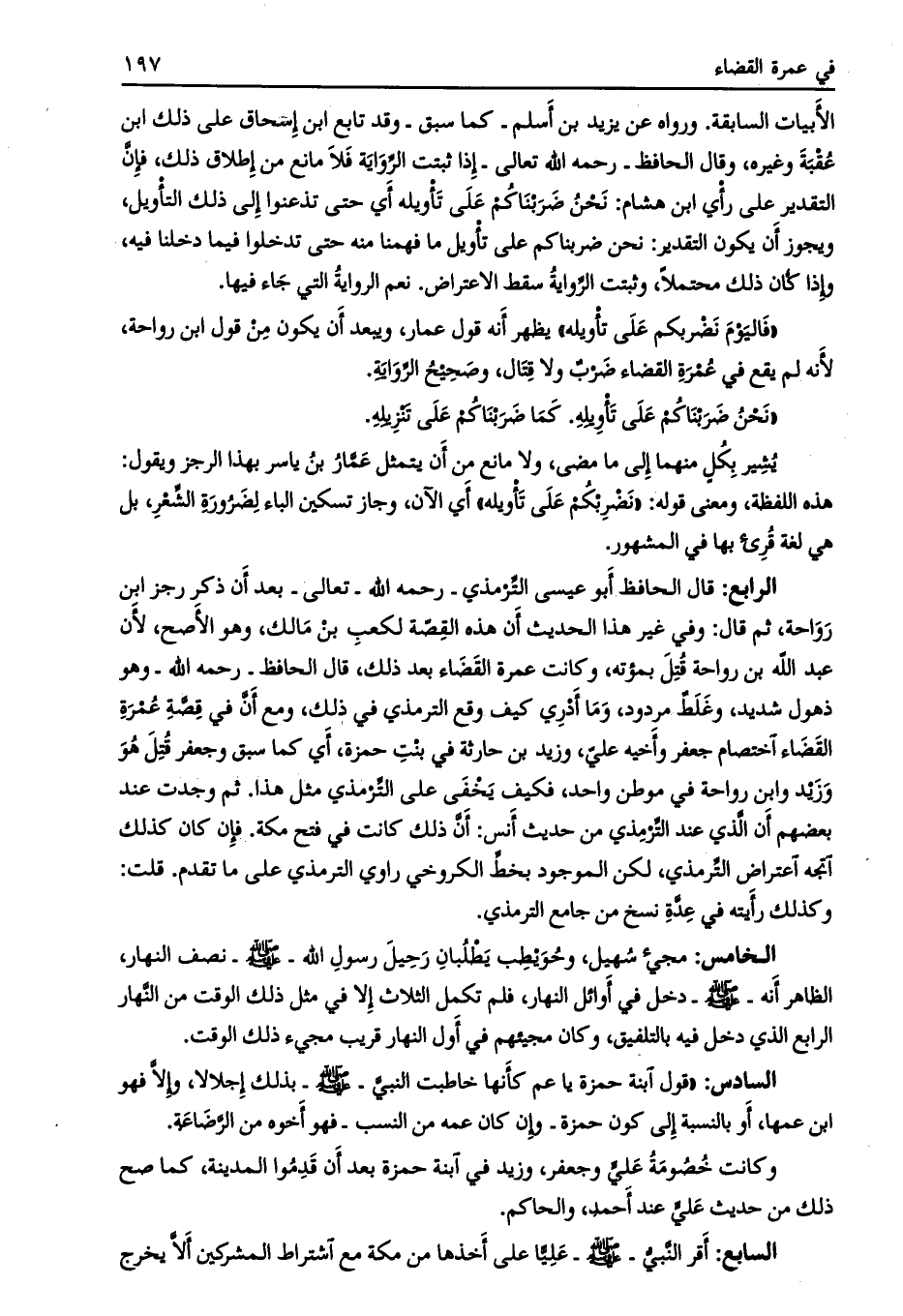 الرابع: قال الحافظ أبو عيسى الترمذي- رحمه اللَّه تعالى- بعد أن ذكر رجز ابن رواحة، ثم قال: وفي غير هذا الحديث أن هذه القصّة لكعب بن مالك، وهو الأصح، لأن عبد الله بن رواحة قتل بمؤتة، وكانت عمرة القضاء بعد ذلك، قال الحافظ- رحمه الله- وهو ذهول شديد، وغلط مردود، وما أدري كيف وقع الترمذي في ذلك، ومع أنّ في قصّة عمرة القضاء اختصام جعفر وأخيه، علي، وزيد بن حارثة في بنت حمزة، أي كما سبق وجعفر قتل هو وزيد وابن رواحة في موطن واحد، فكيف يخفى على التّرمذي مثل هذا. ثم وجدت عند بعضهم أن الّذي عند التّرمذي من حديث أنس: أنّ ذلك كانت في فتح مكة. فإن كان كذلك اتجه اعتراض التّرمذي، لكن الموجود بخطّ الكروخي راوي الترمذي على ما تقدم. قلت: