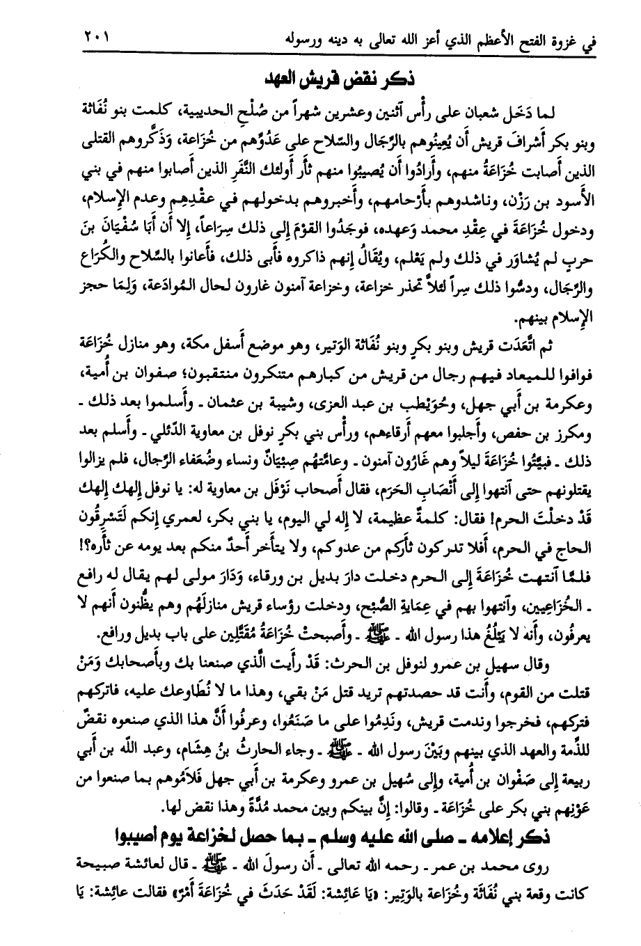 ثم اتّعدت قريش وبنو بكر وبنو نفاثة الوتير، وهو موضع أسفل مكة، وهو منازل خزاعة فوافوا للميعاد فيهم رجال من قريش من كبارهم متنكرون منتقبون، صفوان بن أمية، وعكرمة بن أبي جهل، وحويطب بن عبد العزى، وشيبة بن عثمان- وأسلموا بعد ذلك- ومكرز بن حفص، وأجلبوا معهم أرقاءهم، ورأس بني بكر نوفل بن معاوية الدّئلي- وأسلم بعد ذلك- فبيّتوا خزاعة ليلا وهم غارون آمنون- وعامّتهم صبيان ونساء وضعفاء الرّجال، فلم يزالوا يقتلونهم حتى انتهوا إلى أنصاب الحرم، فقال أصحاب نوفل بن معاوية له: يا نوفل إلهك إلهك قد دخلت الحرم! فقال: كلمة عظيمة، لا إله لي اليوم، يا بني بكر، لعمري إنكم لتسرقون الحاج في الحرم، أفلا تدركون ثأركم من عدوكم، ولا يتأخر أحد منكم بعد يومه عن ثأره؟! فلمّا انتهت خزاعة إلى الحرم دخلت دار بديل بن ورقاء، ودار مولى لهم يقال له رافع الخزاعيين، وانتهوا بهم في عماية الصّبح، ودخلت رؤساء قريش منازلهم وهم يظّنون أنهم لا يعرفون، وأنه لا يبلغ هذا رسول الله- صلى الله عليه وسلم- وأصبحت خزاعة مقتّلين على باب بديل ورافع.
