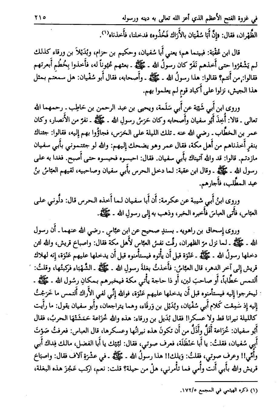 ألتمس حطّابا، أو صاحب لبن، أو ذا حاجة يأتي مكة فيخبرهم بمكان رسول الله- صلى الله عليه وسلم- ليخرجوا إليه فيستأمنوه قبل أن يدخلها عليهم عنوة، فو الله إني لفي الأراك ألتمس ما خرجت إليه إذ سمعت كلام أبي سفيان، وبديل بن ورقاء، وهما يتراجعان، وأبو سفيان يقول: ما رأيت كالليلة نيرانا قط ولا عسكرا! فقال بديل بن ورقاء: هذه والله خزاعة حمشتها الحرب، فقال أبو سفيان: خزاعة أقلّ وأذلّ من أن تكون هذه نيرانها وعسكرها، قال العباس: فعرفت صوت أبي سفيان، فقلت: يا أبا حنظلة، فعرف صوتي، فقال: لبّيك يا أبا الفضل، مالك فداك أبي وأمي!! وعرف صوتي، فقلت: ويلك!! هذا رسول الله- صلى الله عليه وسلم- في عشرة آلاف فقال: واصباح قريش والله بأبي أنت وأمي فما تأمرني، هل من حيلة؟ قلت: نعم، اركب عجز هذه البغلة،