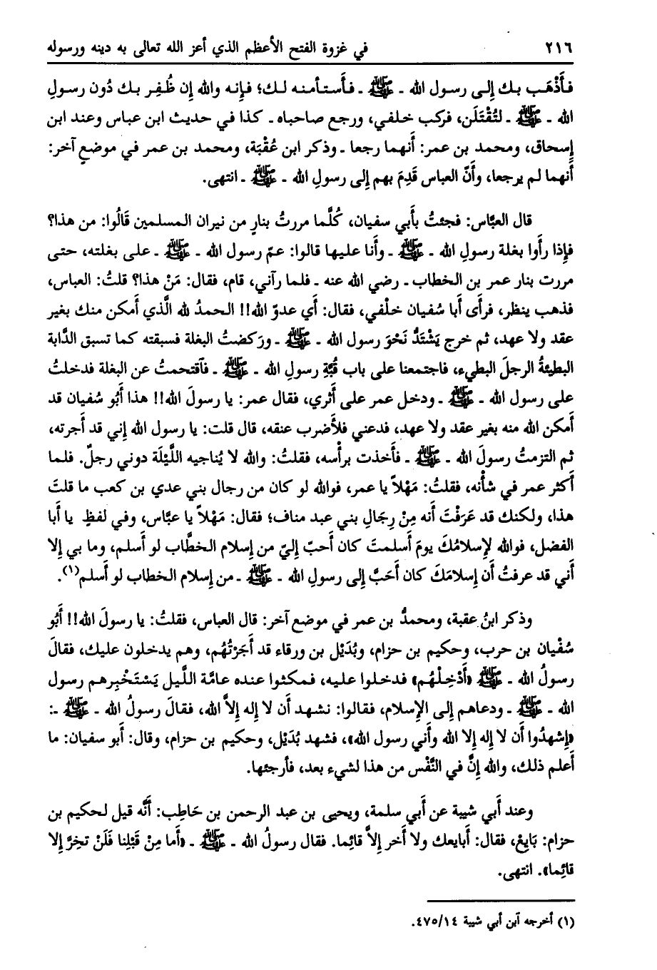 فإذا رأوا بغلة رسول الله- صلى الله عليه وسلّم- وأنا عليها قالوا: عم رسول الله- صلى الله عليه وسلّم- على بغلته، حتى مررت بنار عمر بن الخطاب- رضي الله عنه- فلما رآني، قام، فقال: من هذا؟ قلت: العباس، فذهب ينظر، فرأى أبا سفيان خلفي، فقال: أي عدوّ الله!! الحمد للَّه الذي أمكن منك بغير عقد ولا عهد، ثم خرج يشتدّ نحو رسول الله- صلى الله عليه وسلم- وركضت البغلة فسبقته كما تسبق الدّابة البطيئة الرجل البطيء، فاجتمعنا على باب قبّة رسول الله- صلى الله عليه وسلم- فاقتحمت عن البغلة فدخلت على رسول الله- صلى الله عليه وسلم- ودخل عمر على أثري، فقال عمر: يا رسول الله!! هذا أبو سفيان قد أمكن الله منه بغير عقد ولا عهد، فدعني فلأضرب عنقه، قال قلت: يا رسول الله إني قد أجرته، ثم التزمت رسول الله- صلى الله عليه وسلم- فأخذت برأسه، فقلت: والله لا يناجيه اللّيلة دوني رجل. فلما أكثر عمر في شأنه، فقلت: مهلا يا عمر، فو الله لو كان من رجال بني عدي بن كعب ما قلت هذا، ولكنك قد عرفت أنه من رجال بني عبد مناف، فقال: مهلاً يا عبّاس، وفي لفظ يا أبا الفضل، فو الله لإسلامك يوم أسلمت كان أحب إلى من إسلام الخطاب لو أسلم، وما بي إلا أني قد عرفت أن إسلامك كان أحب إلى رسول الله- صلى الله عليه وسلم- من إسلام الخطاب لو أسلم [ (1) ] .