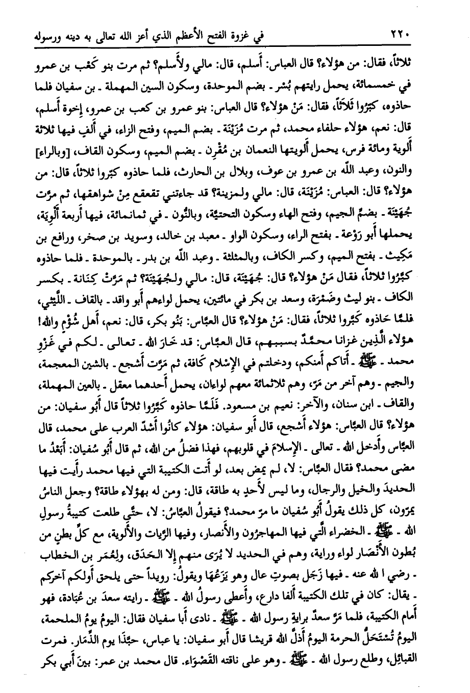 ثلاثا، فقال: من هؤلاء؟ قال العباس: أسلم، قال: مالي ولأسلم؟ ثم مرت بنو كعب بن عمرو في خمسمائة، يحمل رايتهم بسر- بضم الموحدة، وسكون السين المهملة- بن سفيان فلما حاذوه، كبّروا ثلاثا، فقال: من هؤلاء؟ قال العباس: بنو عمرو بن كعب بن عمرو، إخوة أسلم، قال: نعم، هؤلاء حلفاء محمد، ثم مرت مزينة- بضم الميم، وفتح الزاء، في ألف فيها ثلاثة ألوية ومائة فرس، يحمل ألويتها النعمان بن مقرن- بضم الميم، وسكون القاف، [وبالراء] والنون، وعبد الله بن عمرو بن عوف، وبلال بن الحارث، فلما حاذوه كبّروا ثلاثا، قال: من هؤلاء؟ قال: العباس: مزينة، قال: مالي ولمزينة؟ قد جاءتني تقعقع من شواهقها، ثم مرّت جهينة- بضم الجيم، وفتح الهاء وسكون التحتية، وبالنون- في ثمانمائة، فيها أربعة ألوية، يحملها أبو روعة- بفتح الراء، وسكون الواو- معبد بن خالد، وسويد بن صخر، ورافع بن مكيث- بفتح الميم، وكسر الكاف، وبالمثلثة- وعبد الله بن بدر- بالموحدة- فلما حاذوه كبّروا ثلاثا، فقال من هؤلاء؟ قال: جهينة، قال: مالي ولجهينة؟ ثم مرّت كنانة- بكسر الكاف- بنو ليث وضمرة، وسعد بن بكر في مائتين، يحمل لواءهم أبو واقد- بالقاف- اللّيثي، فلمّا حاذوه كبّروا ثلاثا، فقال: من هؤلاء؟ قال العبّاس: بنو بكر، قال: نعم، أهل شؤم والله! هؤلاء الّذين غزانا محمّد بسببهم، قال العبّاس: قد خار الله- تعالى- لكم في غزو محمد- صلى الله عليه وسلم- أتاكم أمنكم، ودخلتم في الإسلام كافة، ثم مرّت أشجع- بالشين المعجمة، والجيم- وهم آخر من مرّ، وهم ثلاثمائة معهم لواءان، يحمل أحدهما معقل- بالعين المهملة، والقاف- ابن سنان، والآخر: نعيم بن مسعود. فلمّا حاذوه كبّروا ثلاثا قال أبو سفيان: من هؤلاء؟ قال العبّاس: هؤلاء أشجع، قال أبو سفيان: هؤلاء كانوا أشدّ العرب على محمد، قال العبّاس وأدخل الله- تعالى- الإسلام في قلوبهم، فهذا فضل من الله، ثم قال أبو سفيان: أبعد ما مضى محمد؟ فقال العباس: لا، لم يمض بعد، لو أتت الكتيبة التي فيها محمد رأيت فيها الحديد والخيل والرجال، وما ليس لأحد به طاقة، قال: ومن له بهؤلاء طاقة؟ وجعل الناس يمرّون، كل ذلك يقول أبو سفيان ما مرّ محمد؟ فيقول العبّاس: لا، حتّى طلعت كتيبة رسول الله- صلى الله عليه وسلم- الخضراء الّتي فيها المهاجرون والأنصار، وفيها الرّيات والألوية، مع كل بطن من بطون الأنصار لواء وراية، وهم في الحديد لا يرى منهم إلا الحدق، ولعمر بن الخطاب- رضي الله عنه- فيها زجل بصوت عال وهو يزعها ويقول: رويدا حتى يلحق أولكم آخركم- يقال: كان في تلك الكتيبة ألفا دارع، وأعطى رسول الله- صلى الله عليه وسلم- رايته سعد بن عبادة، فهو أمام الكتيبة، فلما مرّ سعد براية رسول الله- صلى الله عليه وسلم- نادى أبا سفيان فقال: اليوم يوم الملحمة، اليوم تستحلّ الحرمة اليوم أذلّ الله قريشا قال أبو سفيان: يا عباس، حبّذا يوم الذّمار. فمرت القبائل، وطلع رسول الله- صلى الله عليه وسلم- وهو على ناقته القصواء. قال محمد بن عمر: بين أبي بكر