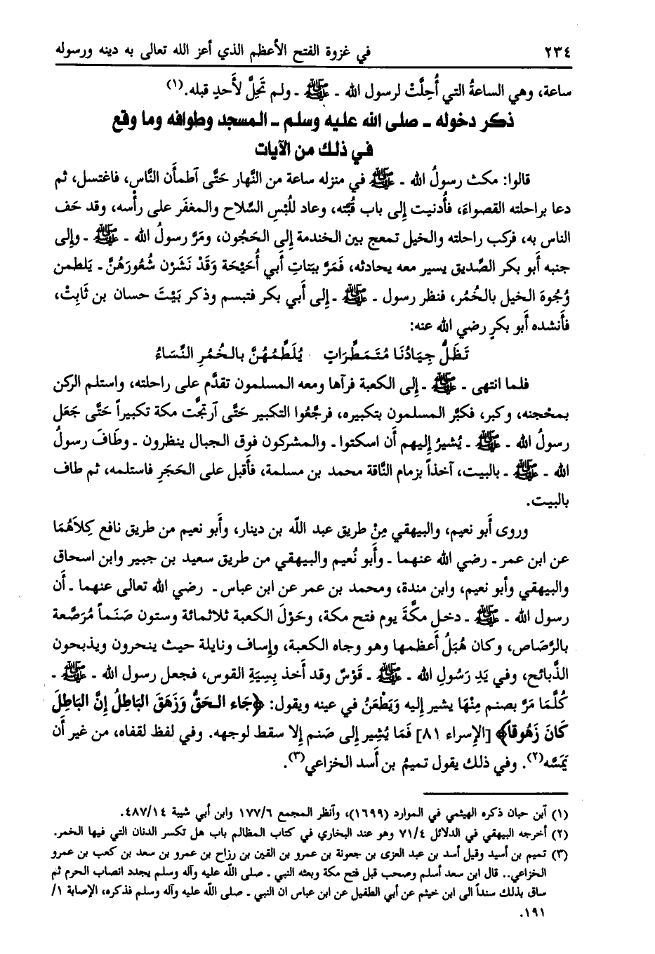 فجعل رسول الله- صلى الله عليه وسلم- كلّما مرّ بصنم منها يشير إليه ويطعن في عينه ويقول: جاءَ الْحَقُّ وَزَهَقَ الْباطِلُ إِنَّ الْباطِلَ كانَ زَهُوقاً [الإسراء 81]