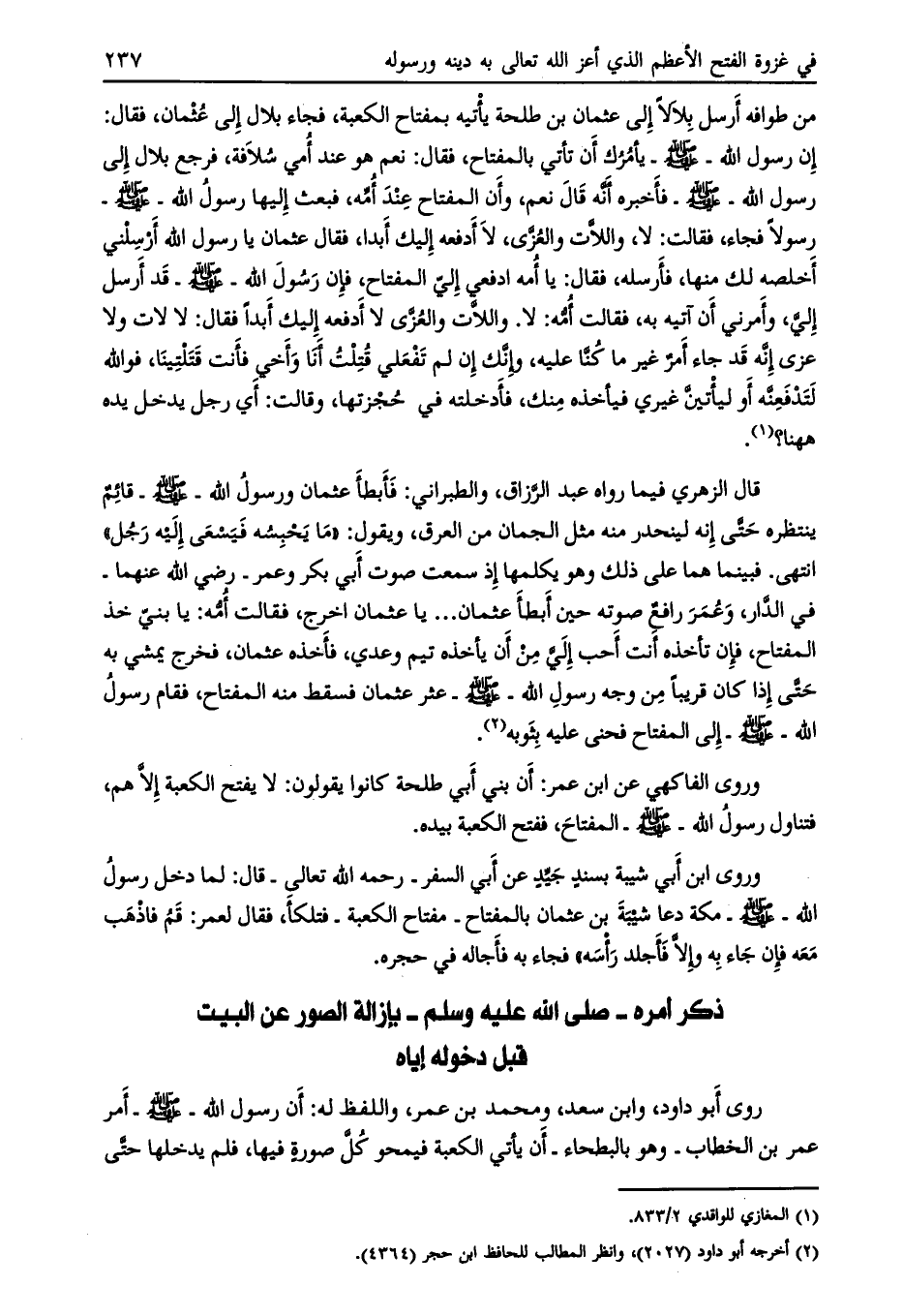 وروى الفاكهي عن ابن عمر: إن بني أبي طلحة كانوا يقولون: لا يفتح الكعبة إلّا هم، فتناول رسول الله- صلى الله عليه وسلم- المفتاح، ففتح الكعبة بيده.