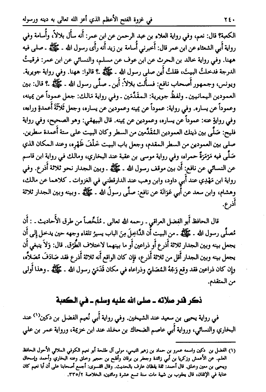 صلى بين العمودين من السطر المقدم، وجعل باب البيت خلف ظهره، وعند المكان الذي صلّى فيه مرمرة حمراء، وفي رواية موسى بن عقبة عند البخاري، ومالك في رواية ابن قاسم عن النسائي عن نافع: أن بين موقف رسول الله- صلى الله عليه وسلم- وبين الجدار نحو ثلاثة أذرع. وفي رواية ابن مهدي عند أبي داود، وابن وهب عند الدارقطني في الغزوات- كلاهما عن مالك، وهشام، وابن سعد عن أبي عوانة عن نافع: صلى رسول الله- صلى الله عليه وسلّم- وبينه وبين الجدار ثلاثة أذرع.