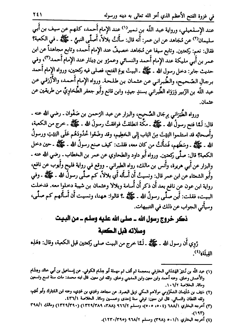 فقال: نعم: ركعتين. وتابع سيفا عن مجاهد خصيف عند الإمام أحمد، وتابع مجاهدا عن ابن عمر بن أبي مليكة عند الإمام أحمد والنسائي وعمرو بن دينار عند الإمام أحمد [ (3) ] ، وفي حديث جابر: دخل رسول الله- صلى الله عليه وسلّم- البيت يوم الفتح، فصلى فيه ركعتين، ورواه الإمام أحمد برجال الصحيح، والطبراني عن عثمان بن طلحة. ورواه الإمام أحمد، والأزرقي عن عبد الله بن الزبير ورواه الطبراني بسند جيد، وابن قانع وأبو جعفر الطّحاويّ من طريقين عن عثمان.