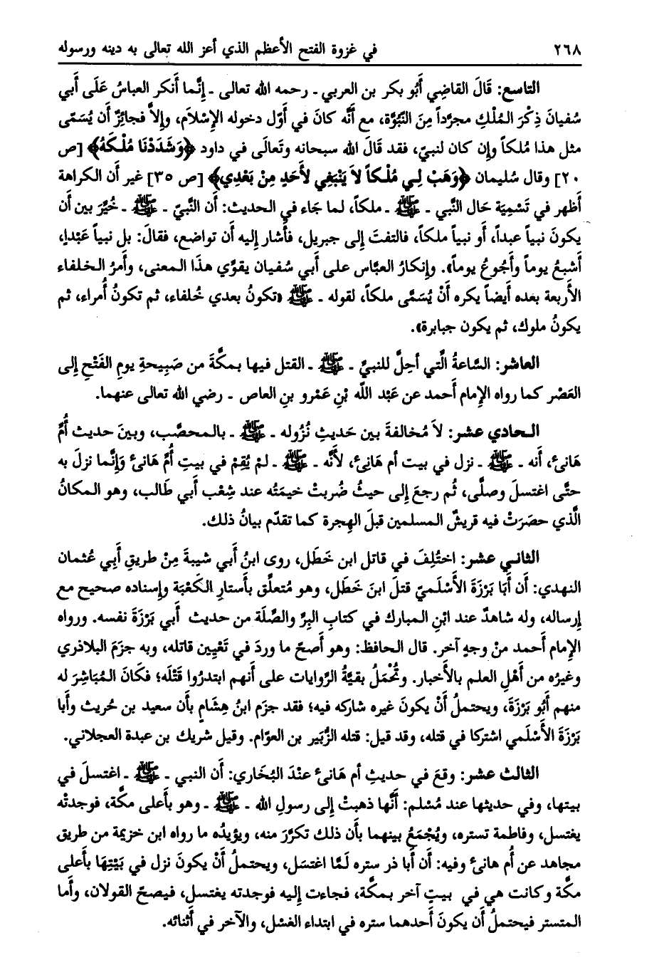 التاسع: قال القاضي أبو بكر بن العربي- رحمه الله تعالى- إنّما أنكر العباس على أبي سفيان ذكر الملك مجرّدا من النبوة، مع أنه كان في أول دخوله الإسلام، وإلّا فجائز أن يسمّى مثل هذا ملكا وإن كان لنبيّ، فقد قال الله سبحانه وتعالى في داود وَشَدَدْنا مُلْكَهُ [ص 20] وقال سليمان وَهَبْ لِي مُلْكاً لا يَنْبَغِي لِأَحَدٍ مِنْ بَعْدِي [ص 35] غير أن الكراهة أظهر في تسمية حال النبي- صلى الله عليه وسلم- ملكا، لما جاء في الحديث: إن النبي- صلى الله عليه وسلم- خير بين أن يكون نبيا عبدا، أو نبيا ملكا، فالتفت إلى جبريل، فأشار إليه أن تواضع، فقال: بل نبياً عبداً، أشبع يوما وأجوع يوما» . وإنكار العبّاس على أبي سفيان يقوّي هذا المعنى، وأمر الخلفاء الأربعة بعده أيضا يكره أن يسمّى ملكا، لقوله- صلى الله عليه وسلّم «تكون بعدي خلفاء، ثم تكون أمراء، ثم يكون ملوك، ثم يكون جبابرة» .