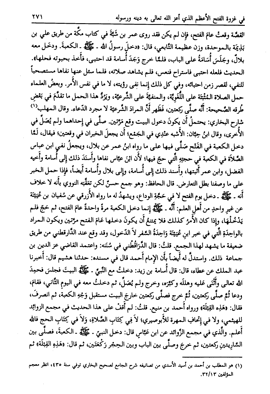 الحديث فلعله احتبى فاستراح فنعس، فلم يشاهد صلاته، فلما سئل عنها نفاها مستصحبا للنفي، لقصر زمن احتبائه، وفي كل ذلك إنما نفى رؤيته، لا ما في نفس الأمر. وبعض العلماء حمل الصلاة المثبتة على اللّغويّة، والمنفيّة على الشّرعيّة، ويردّ هذا الحمل ما تقدم في بعض طرقه الصحيحة: أنه صلى ركعتين، فظهر أنّ المراد الشّرعية لا مجرد الدعاء. وقال المهلب [ (1) ] شارح البخاري: يحتمل أن يكون دخول البيت وقع مرّتين. صلّى في إحداهما ولم يصلّ في الأخرى، وقال ابن حبان: الأشبه عندي في الجمع، أن يجعل الخبران في وقعتين، فيقال، لمّا دخل الكعبة في الفتح صلّى فيها على ما رواه ابن عمر عن بلال، ويجعل نفي ابن عباس الصّلاة في الكعبة في حجته التي حج فيها، لأن ابن عبّاس نفاها وأسند ذلك إلى أسامة وأخيه الفضل، وابن عمر أثبتها، وأسند ذلك إلى أسامة، وإلى بلال وأسامة أيضا، فإذا حمل الخبر على ما وصفنا بطل التعارض. قال الحافظ: وهو جمع حسن لكن تعقّبه النووي بأنه لا خلاف أنه- صلى الله عليه وسلم- دخل يوم الفتح لا في حجة الوداع، ويشهد له ما رواه الأزرقي عن سفيان بن عيينة عن غير واحد من أهل العلم: أنه- صلى الله عليه وسلم- إنما دخل الكعبة مرة واحدة عام الفتح، ثم حجّ فلم يدخلها، وإذا كان الأمر كذلك فلا يمتنع أن يكون دخلها عام الفتح مرّتين ويكون المراد بالواحدة الّتي في خبر ابن عيينة واحدة السّفر لا الدّخول، وقد وقع عند الدّارقطني من طريق ضعيفة ما يشهد لهذا الجمع. قلت: قال الدّارقطني في سننه: واعتمد القاضي عز الدين بن جماعة ذلك. واستدلّ له أيضا بأن الإمام أحمد قال في مسنده: حدثنا هشيم قال: أخبرنا عبد الملك عن عطاء، قال: قال أسامة بن زيد: دخلت مع النبي- صلى الله عليه وسلم البيت فجلس فحمد الله تعالى وأثنى عليه وهلله وكبّره، وخرج ولم يصلّ، ثم دخلت معه في اليوم الثّاني، فقام، ودعا ثمّ صلّى ركعتين، ثم خرج فصلى ركعتين خارج البيت مستقبل وجه الكعبة، ثم انصرف، فقال: «هذه القبلة» ورواه أحمد بن منيع. قلت: لم أقف على هذا الحديث في مجمع الزوائد للهيثمي، ولا في إتحاف المهرة للأبوصيري، لا في كتاب الصلاة، ولا في كتاب الحج فالله أعلم. والّذي