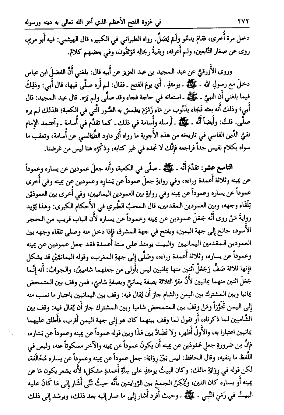 وروى الأزرقي عن عبد المجيد بن عبد العزيز عن أبيه قال: بلغني أنّ الفضل ابن عباس دخل مع رسول الله- صلى الله عليه وسلم- يومئذ- أي يوم الفتح- فقال: لم أره صلّى فيها، قال أبي: وذلك فيما بلغني أن النبي- صلى الله عليه وسلّم- استعانه في حاجة فجاء وقد صلّى ولم يره. قال عبد المجيد: قال أبي، وذلك أنه بعثه فجاء بذنوب من ماء زمزم يطمس به الصّور الّتي في الكعبة، فلذلك لم يره صلّى. قلت: وأيضا أنه- صلى الله عليه وسلم- أرسله وأسامة في ذلك- كما تقدّم في أسامة- واعتمد الإمام تقيّ الدّين الفاسي في تاريخه من هذه الأجوبة ما رواه أبو داود الطيالسي عن أسامة، وتعقب ما سواه بكلام نفيس جدا فراجعه فإنّك لا تجده في غير كتابه، وذكره هنا ليس من غرضنا.