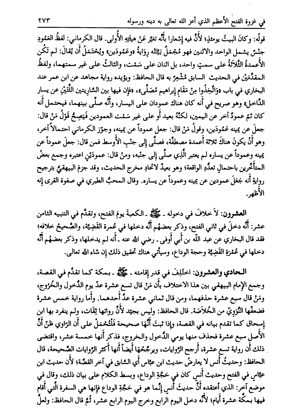 الحادي والعشرون: اختلف في قدر إقامته- صلى الله عليه وسلّم- بمكة كما تقدم في القصة، وجمع الإمام البيهقي بين هذا الاختلاف بأن من قال تسع عشرة عدّ يوم الدّخول والخروج، ومن قال سبع عشرة حذفهما، ومن قال ثماني عشرة عدّ أحدهما. وأما رواية خمس عشرة فضعفّها النّوويّ من الخلاصة. قال الحافظ: وليس بجيّد لأنّ رواتها ثقات، ولم ينفرد بها ابن إسحاق كما تقدم بيانه في القصة، وإذا ثبت أنّها صحيحة فلتحمل على أن الرّاوي ظنّ أنّ الأصل سبع عشرة فحذف منها يومي الدّخول والخروج، فذكر أنها خمسة عشر، واقتضى ذلك أن رواية تسع عشرة، أرجح الرّوايات، ويرجّحها أيضا أنّها أكثر الرّوايات الصّحيحة، قال الحافظ: وحديث أنس لا يعارض حديث ابن عباس أي السابق في آخر القصّة، لأن حديث ابن عباس في الفتح وحديث أنس كان في حجة الوداع، وبسط الكلام على بيان ذلك، وقال في موضع آخر: الذي أعتقده أنّ حديث أنس إنما هو في حجّة الوداع فإنها هي السفرة الّتي أقام فيها بمكّة عشرة أيام، لأنّه دخل اليوم الرابع وخرج اليوم الرابع عشر، ثم قال الحافظ: ولعل