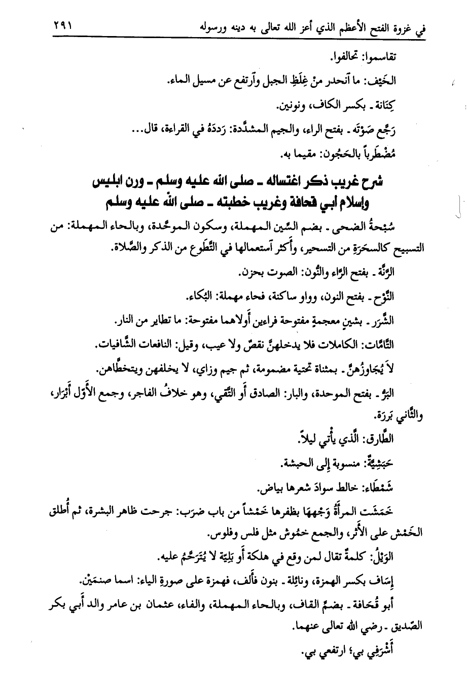 شرح غريب ذكر اغتساله- صلى الله عليه وسلّم- ورن إبليس وإسلام أبي قحافة وغريب خطبته- صلى الله عليه وسلّم