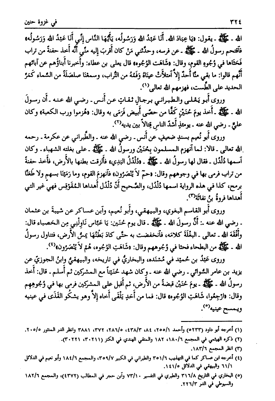 وروى أبو يعلى والطبراني برجال ثقات عن أنس- رضي الله عنه- أن رسول الله- صلى الله عليه وسلم- أخذ يوم حنين كفّا من حصى أبيض فرمى به وقال: «هزموا ورب الكعبة» وكان علي- رضي الله عنه- يومئذ أشدّ الناس قتالا بين يديه