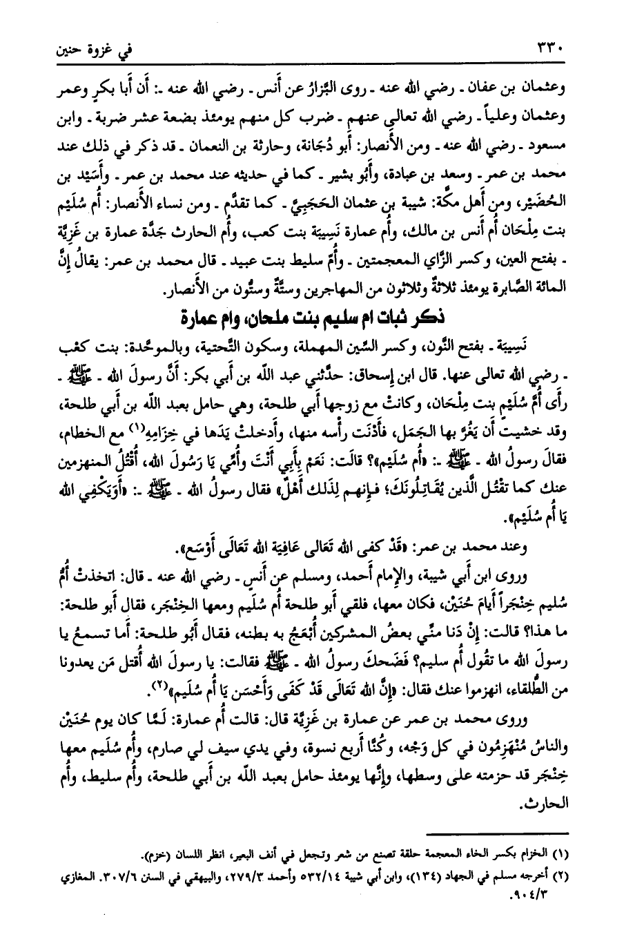 وروى محمد بن عمر عن عمارة بن غزيّة قال: قلت أم عمارة: لما كان يوم حنين والناس منهزمون في كل وجه، وكنّا أربع نسوة، وفي يدي سيف لي صارم، وأم سليم معها خنجر قد حزمته على وسطها، وإنّها يومئذ حامل بعبد الله بن أبي طلحة، وأم سليط، وأم الحارث.