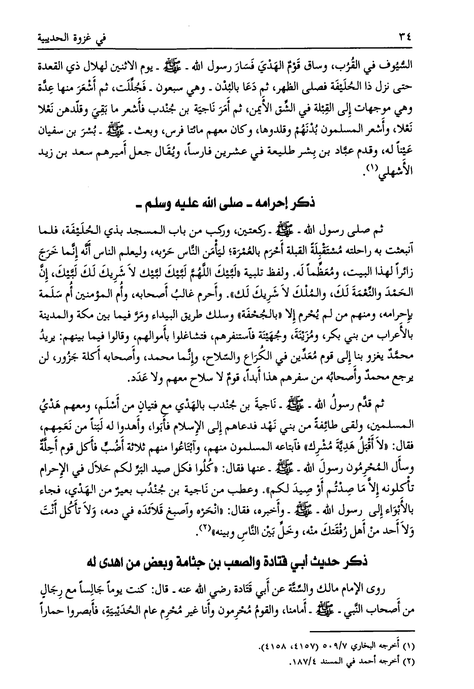 ثم صلى رسول الله- صلى الله عليه وسلّم- ركعتين، وركب من باب المسجد بذي الحليفة، فلما انبعثت به راحلته مستقبلة القبلة أحرم بالعمرة، ليأمن النّاس حربه، وليعلم الناس أنّه إنّما خرج زائرا لهذا البيت، ومعظّما له.