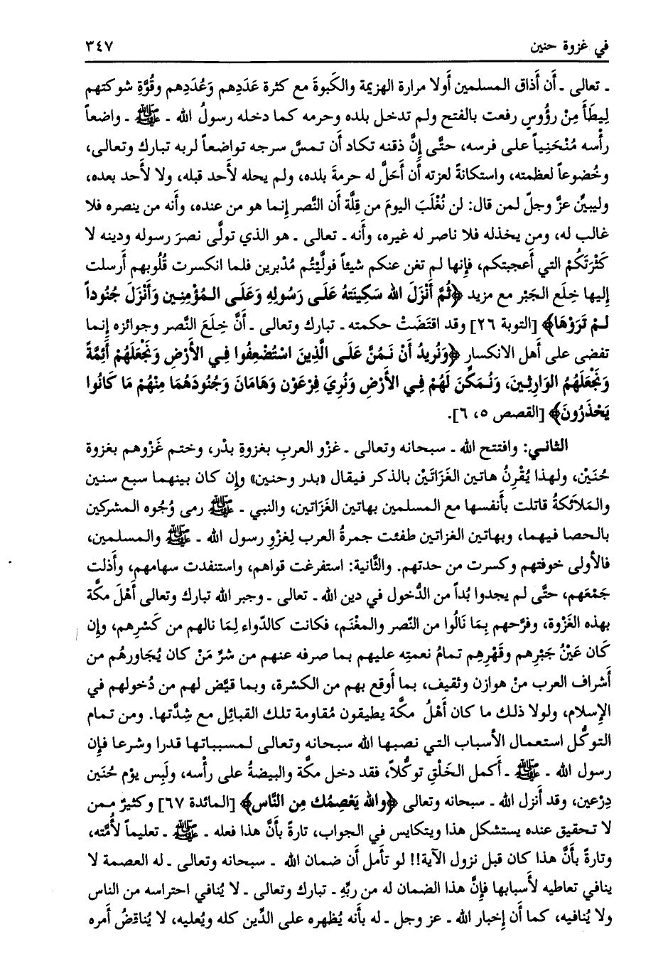 الثاني: وافتتح الله- سبحانه وتعالى- غزو العرب بغزوة بدر، وختم غزوهم بغزوة حنين، ولهذا يقرن هاتين الغزاتين بالذكر فيقال «بدر وحنين» وإن كان بينهما سبع سنين والملائكة قاتلت بأنفسها مع المسلمين بهاتين الغزاتين، والنبي- صلى الله عليه وسلم رمى وجوه المشركين بالحصا فيهما، وبهاتين الغزاتين طفئت جمرة العرب لغزو رسول الله- صلى الله عليه وسلم والمسلمين، فالأولى خوفتهم وكسرت من حدتهم. والثّانية: استفرغت قواهم، واستنفدت سهامهم، وأذلت جمعهم، حتّى لم يجدوا بدا من الدّخول في دين الله- تعالى- وجبر الله تبارك وتعالى أهل مكّة بهذه الغزوة، وفرّحهم بما نالوا من النّصر والمغنم، فكانت كالدّواء لما نالهم من كسرهم، وإن كان عين جبرهم وقهرهم تمام نعمته عليهم بما صرفه عنهم من شرّ من كان يجاورهم من أشراف العرب من هوازن وثقيف، بما أوقع بهم من الكسرة، وبما قيّض لهم من دخولهم في الإسلام، ولولا ذلك ما كان أهل مكّة يطيقون مقاومة تلك القبائل مع شدّتها. ومن تمام التوكّل استعمال الأسباب التي نصبها الله سبحانه وتعالى لمسبباتها قدرا وشرعا فإن رسول الله- صلى الله عليه وسلّم- أكمل الخلق توكّلا، فقد دخل مكّة والبيضة على رأسه، ولبس يوم حنين درعين، وقد أنزل الله- سبحانه وتعالى وَاللَّهُ يَعْصِمُكَ مِنَ النَّاسِ [المائدة 67] وكثير ممن لا تحقيق عنده يستشكل هذا ويتكايس في الجواب، تارة بأنّ هذا فعله- صلى الله عليه وسلم- تعليما لأمّته، وتارة بأنّ هذا كان قبل نزول الآية!! لو تأمل أن ضمان الله- سبحانه وتعالى- له العصمة لا ينافي تعاطيه لأسبابها فإنّ هذا الضمان له من ربه- تبارك وتعالى- لا ينافي احتراسه من الناس ولا ينافيه، كما أن إخبار الله- عز وجل- له بأنه يظهره على الدين كله ويعليه، لا يناقض أمره