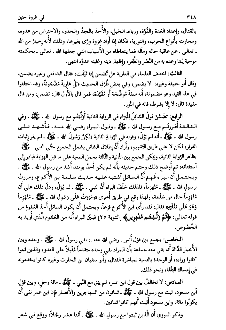 الرابع: تضمّن قول السّائل للبراء في الرواية الثانية أولّيتم مع رسول الله- صلى الله عليه وسلّم- وفي الثالثة أفررتم مع رسول الله- صلى الله عليه وسلّم- وقول البراء رضي الله عنه- فأشهد على رسول الله- صلى الله عليه وسلم- إنه لم يولّ، وقوله في الرّواية الثانية «لكنّ رسول الله- صلى الله عليه وسلم- لم يقر إثبات الفرار، لكن لا على طريق التعميم، وأراد أنّ إطلاق السّائل يشمل الجميع حتّى النبي- صلى الله عليه وسلّم- بظاهر الرّواية الثانية، ويمكن الجمع بين الثّانية والثّالثة بحمل المعية على ما قبل الهزيمة فبادر إلى استثنائه، ثم أوضح ذلك وختم حديثه بأنه لم يكن أحد يومئذ أشد من رسول الله- صلى الله عليه وسلم- ويحتمل أن البراء فهم أنّ السائل اشتبه عليه حديث سلمة بن الأكوع، ومررت برسول الله- صلى الله عليه وسلم- منهزما، فلذلك حلف البراء إن النبي- صلى الله عليه وسلم- لم يولّ، ودلّ ذلك على أن منهزما حال من سلمة، ولهذا وقع في طريق أخرى «ومررت على رسول الله- صلى الله عليه وسلّم- منهزما وهو على بغلته» فقال: لقد رأى ابن الأكوع فزعا، ويحتمل أن يكون السائل أخذ العموم من قوله تعالى: ثُمَّ وَلَّيْتُمْ مُدْبِرِينَ [التوبة 25] فبيّن البراء أنه من العموم الذي أريد به الخصوص.