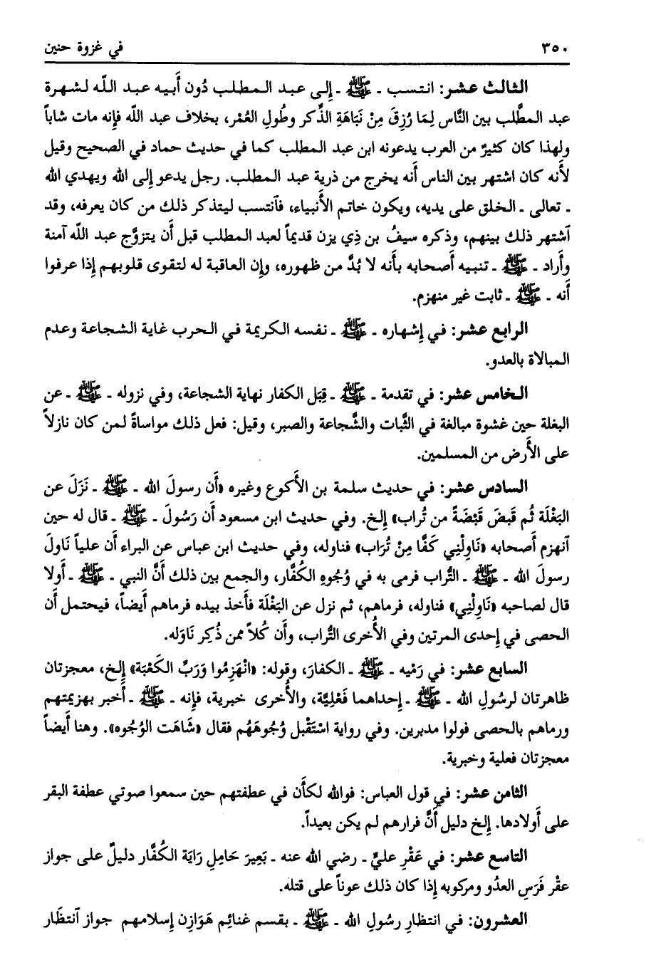 السابع عشر: في رميه- صلى الله عليه وسلّم- الكفار، وقوله: «انهزموا وربّ الكعبة» إلخ، معجزتان ظاهرتان لرسول الله- صلى الله عليه وسلم- إحداهما فعليّة، والأخرى خبرية، فإنه- صلى الله عليه وسلم- أخبر بهزيمتهم ورماهم بالحصى فولوا مدبرين. وفي رواية استقبل وجوههم فقال «شاهت الوجوه» . وهنا أيضا معجزتان فعلية وخبرية.