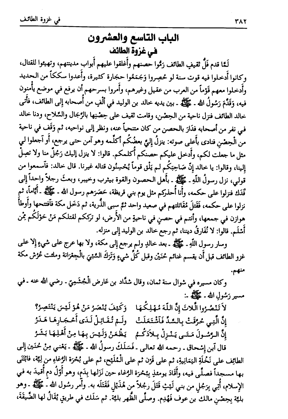 لمّا قدم فلّ ثقيف الطائف رمّوا حصنهم وأغلقوا عليهم أبواب مدينتهم، وتهيئوا للقتال، وكانوا أدخلوا فيه قوت سنة لو حصروا وجمعوا حجارة كثيرة، وأعدوا سككا من الحديد وأدخلوا معهم قوما من العرب من عقيل وغيرهم، وأمروا بسرحهم أن يرفع في موضع يأمنون فيه، وقدّم رسول الله- صلى الله عليه وسلم- بين يديه خالد بن الوليد في ألف من أصحابه إلى الطائف، فأتى خالد الطائف فنزل ناحية من الحصن، وقامت ثقيف على حصنها بالرّجال والسّلاح، ودنا خالد في نفر من أصحابه فدار بالحصن من كان متنحيا عنه، ونظر إلى نواحيه، ثم وقف في ناحية من الحصن فنادى بأعلى صوته: ينزل إليّ بعضكم أكلّمه وهو آمن حتى يرجع، أو اجعلوا لي مثل ما جعلت لكم، وأدخل عليكم حصنكم أكلمكم. قالوا: لا ينزل إليك رجل منا ولا تصل إلينا، وقالوا: يا خالد إنّ صاحبكم لم يلق قوما يحسنون قتاله غيرنا. قال خالد: فاسمعوا من قولي، نزل رسول الله- صلى الله عليه وسلم- بأهل الحصون والقوة بيثرب وخيبر، وبعث رجلا واحدا إلى فدك فنزلوا على حكمه، وأنا أحذركم مثل يوم بني قريظة، حصرهم رسول الله- صلى الله عليه وسلم- أيّاما، ثم نزلوا على حكمه، فقتل مقاتلتهم في صعيد واحد ثمّ سبى الذّرية، ثم دخل مكة فافتتحها وأوطأ هوازن في جمعها، وأنتم في حصن في ناحية من الأرض، لو ترككم لقتلكم من حولكم ممن أسلم. قالوا: لا نفارق ديننا، ثم رجع خالد بن الوليد إلى منزله.