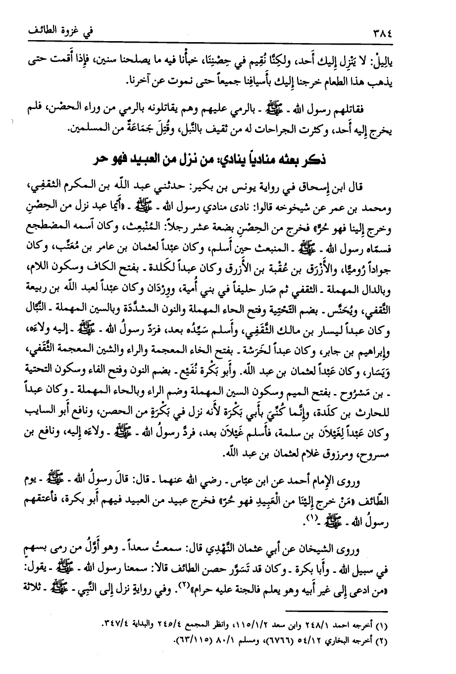وروى الإمام أحمد عن ابن عباس- رضي الله عنهما- قال: قال رسول الله- صلى الله عليه وسلم- يوم الطّائف «من خرج إلينا من العبيد فهو حرّ» فخرج عبيد من العبيد فيهم أبو بكرة، فأعتقهم رسول الله- صلى الله عليه وسلم-