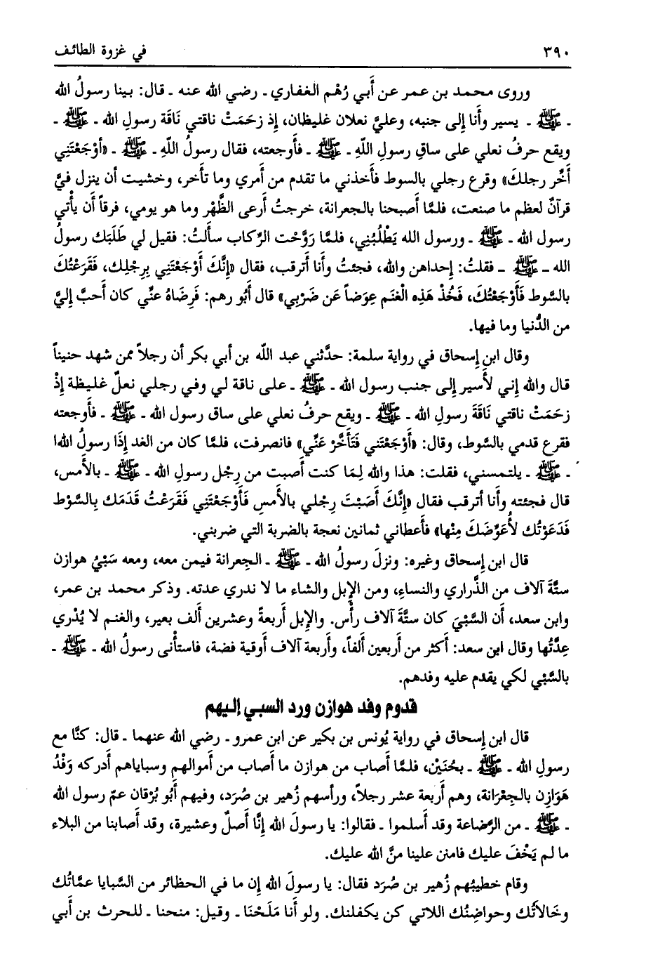 قال ابن إسحاق وغيره: ونزل رسول الله- صلى الله عليه وسلّم- الجعرانة فيمن معه، ومعه سبي هوازن ستّة آلاف من الذّراري والنساء، ومن الإبل والشاء ما لا ندري عدته. وذكر محمد بن عمر، وابن سعد، أن السّبي كان ستّة آلاف رأس. والإبل أربعة وعشرين ألف بعير، والغنم لا يدري عدّتها وقال ابن سعد: أكثر من أربعين ألفا، وأربعة آلاف أوقية فضة، فاستأنى رسول الله- صلى الله عليه وسلم- بالسّبي لكي يقدم عليه وفدهم.