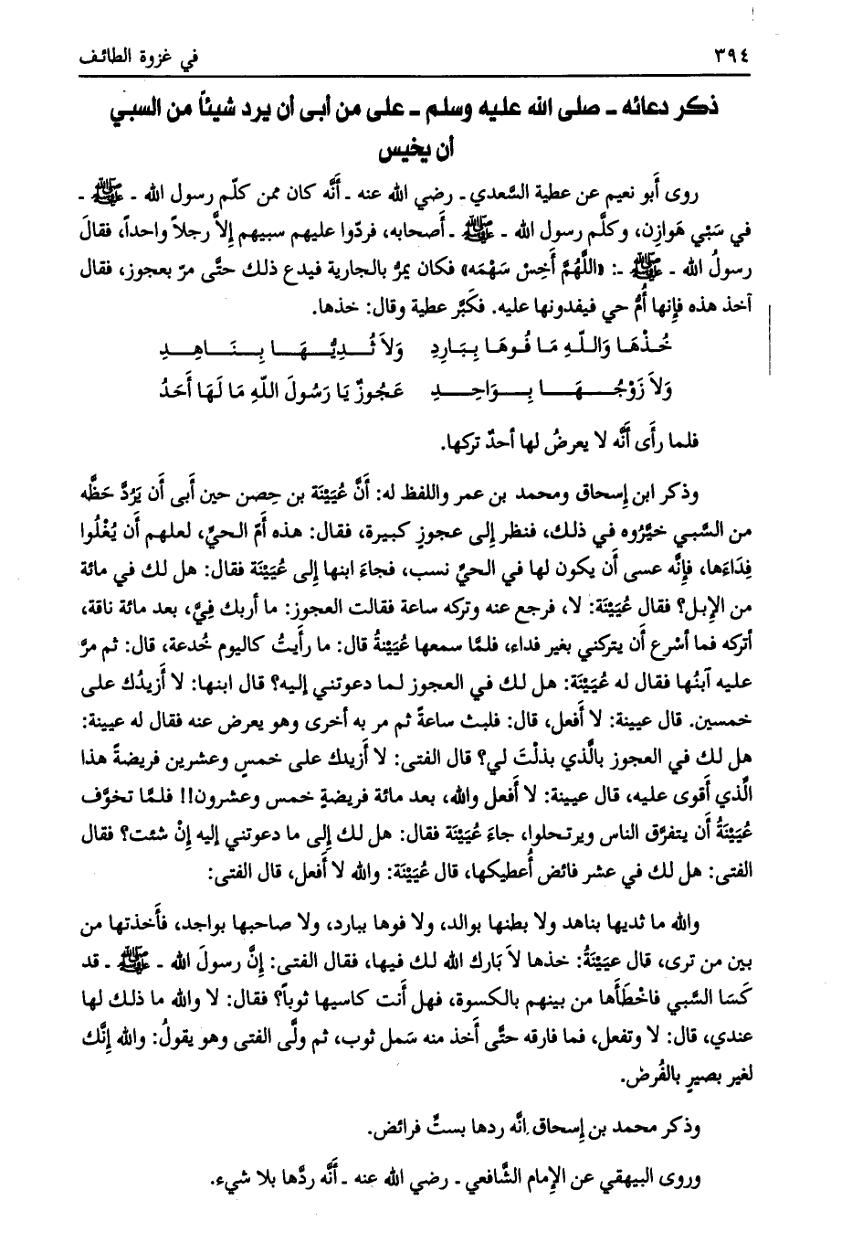 وذكر ابن إسحاق ومحمد بن عمر واللفظ له: أن عيينة بن حصن حين أبى أن يردّ حظّه من السّبي خيّروه في ذلك، فنظر إلى عجوز كبيرة، فقال: هذه أمّ الحيّ، لعلهم أن يغلوا فداءها، فإنه عسى أن يكون لها في الحيّ نسب، فجاء ابنها إلى عيينة فقال: هل لك في مائة من الإبل؟ فقال عيينة: لا، فرجع عنه وتركه ساعة فقالت العجوز: ما أربك فيّ، بعد مائة ناقة، أتركه فما أسرع أن يتركني بغير فداء، فلمّا سمعها عيينة قال: ما رأيت كاليوم خدعة، قال: ثم مرّ عليه ابنها فقال له عيينة: هل لك في العجوز لما دعوتني إليه؟ قال ابنها: لا أزيدك على خمسين. قال عيينة: لا أفعل، قال: فلبث ساعة ثم مر به أخرى وهو يعرض عنه فقال له عيينة: