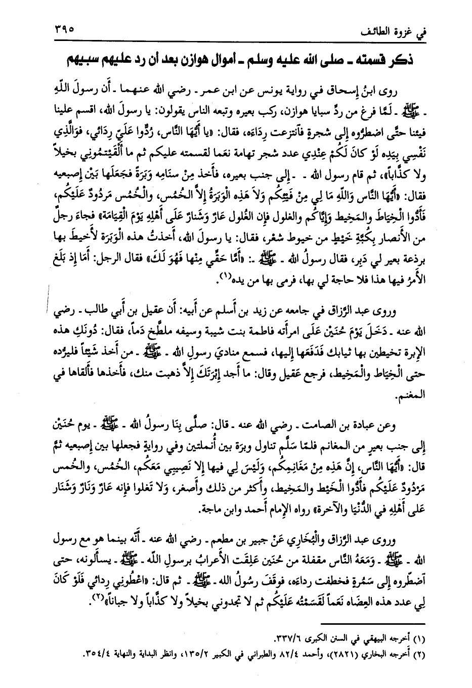روى ابن إسحاق في رواية يونس عن ابن عمر- رضي الله عنهما- أن رسول الله- صلى الله عليه وسلّم- لما فرغ من ردّ سبايا هوازن، ركب بعيره وتبعه الناس يقولون: يا رسول الله، اقسم علينا فيئنا حتّى اضطرّوه إلى شجرة فانتزعت رداءه، فقال: «يا أيها الناس، ردّوا عليّ ردائي، فو الذي نفسي بيده لو كان لكم عندي عدد شجر تهامة نعما لقسمته عليكم ثم ما ألقيتموني بخيلا ولا كذّابا» ، ثم قام رسول الله- إلى جنب بعيره، فأخذ من سنامه وبرة فجعلها بين إصبعيه فقال: «أيّها النّاس والله ما لي من فيئكم ولا هذه الوبرة إلا الخمس، والخمس مردود عليكم، فأدّوا الخياط والمخيط وإيّاكم والغلول فإن الغلول عار وشنار على أهله يوم القيامة» فجاء رجل من الأنصار بكبّة خيط من خيوط شعر، فقال: يا رسول الله، أخذت هذه الوبرة لأخيط بها برذعة بعير لي دبر، فقال رسول الله- صلى الله عليه وسلّم-: «أمّا حقّي منها فهو لك» فقال الرجل: أما إذ بلغ الأمر فيها هذا فلا حاجة لي بها، فرمى بها من يده