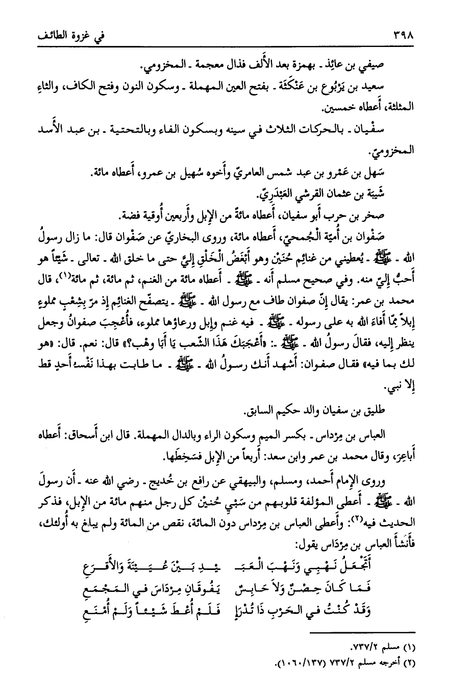 وروى الإمام أحمد، ومسلم، والبيهقي عن رافع بن خديج- رضي الله عنه- أن رسول الله- صلى الله عليه وسلّم- أعطى المؤلفة قلوبهم من سبي حنين كل رجل منهم مائة من الإبل، فذكر الحديث فيه [ (2) ] : وأعطى العباس بن مرداس دون المائة، نقص من المائة ولم يبلغ به أولئك، فأنشأ العباس بن مرداس يقول: