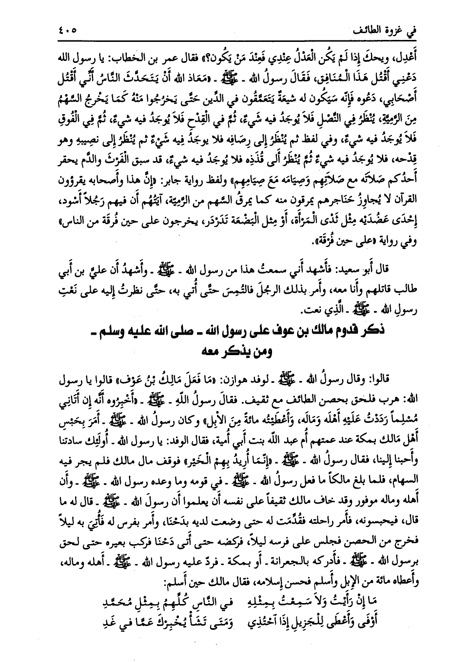 قالوا: وقال رسول الله- صلى الله عليه وسلم- لوفد هوازن: «ما فعل مالك بن عوف» قالوا يا رسول الله: هرب فلحق بحصن الطائف مع ثقيف. فقال رسول الله- صلى الله عليه وسلّم- «أخبروه أنّه إن أتاني مسلما رددت عليه أهله وماله، وأعطيته مائة من الإبل» وكان رسول الله- صلى الله عليه وسلّم- أمر بحبس أهل مالك بمكة عند عمتهم أم عبد الله بنت أبي أمية، فقال الوفد: يا رسول الله- أولئك سادتنا وأحبنا إلينا، فقال رسول الله- صلى الله عليه وسلّم- «إنّما أريد بهم الخير» فوقف مال مالك فلم يجر فيه السهام، فلما بلغ مالكا ما فعل رسول الله- صلى الله عليه وسلم- في قومه وما وعده رسول الله- صلى الله عليه وسلم- وأن أهله وماله موفور وقد خاف مالك ثقيفا على نفسه أن يعلموا أن رسول الله- صلى الله عليه وسلم- قال له ما قال، فيحبسونه، فأمر راحلته فقدّمت له حتى وضعت لديه بدحنا، وأمر بفرس له فأتي به ليلا فخرج من الحصن فجلس على فرسه ليلا، فركضه حتى أتى دحنا فركب بعيره حتى لحق برسول الله- صلى الله عليه وسلم- فأدركه بالجعرانة- أو بمكة- فرد عليه رسول الله- صلى الله عليه وسلّم- أهله وماله، وأعطاه مائة من الإبل وأسلم فحسن إسلامه،