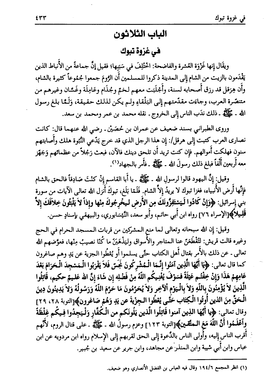 وروى الطبراني بسند ضعيف عن عمران بن حصين- رضي الله عنهما قال: كانت نصارى العرب كتبت إلى هرقل/: إن هذا الرجل الذي قد خرج يدّعي النبوّة هلك وأصابتهم سنون فهلكت أموالهم. فإن كنت تريد أن تلحق دينك فالآن، فبعث رجلا من عظمائهم وجهّز معه أربعين ألفا فبلغ ذلك رسول الله- صلى الله عليه وسلم- فأمر بالجهاد [ (1) ] .