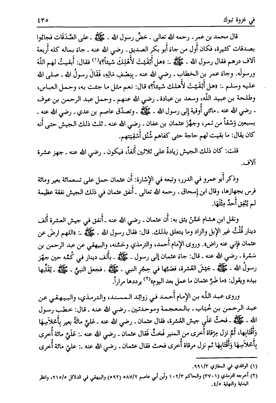 وروى عبد الله بن الإمام أحمد في زوائد المسند، والترمذي، والبيهقي عن عبد الرحمن بن خباب- بالمعجمة وموحدتين- رضي الله عنه- قال: خطب رسول الله- صلى الله عليه وسلّم- فحثّ على جيش العسرة، فقال عثمان- رضي الله عنه- عليّ مائة بعير بأحلاسها وأقتابها، ثمّ نزل مرقاة أخرى من المنبر فحثّ فقال عثمان- رضي الله عنه-: عليّ مائة أخرى بأحلاسها وأقتابها ثم نزل مرقاة أخرى فحث فقال عثمان- رضي الله عنه-: عليّ مائة أخرى