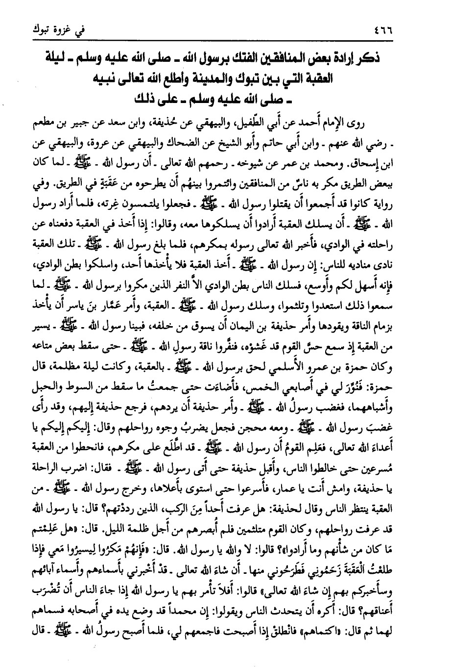 قال حمزة: فنوّر لي في أصابعي الخمس، فأضاءت حتى جمعت ما سقط من السوط والحبل وأشباههما، فغضب رسول الله- صلى الله عليه وسلم- وأمر حذيفة أن يردهم، فرجع حذيفة إليهم، وقد رأى غضب رسول الله- صلى الله عليه وسلّم- ومعه محجن فجعل يضرب وجوه رواحلهم وقال: إليكم إليكم يا أعداء الله تعالى، فعلم القوم أن رسول الله- صلى الله عليه وسلّم- قد اطّلع على مكرهم، فانحطوا من العقبة مسرعين حتى خالطوا الناس، وأقبل حذيفة حتى أتى رسول الله- صلى الله عليه وسلّم- فقال: اضرب الراحلة يا حذيفة، وامش أنت يا عمار، فأسرعوا حتى استوى بأعلاها، وخرج رسول الله- صلى الله عليه وسلم- من العقبة ينتظر الناس وقال لحذيفة: هل عرفت أحدا من الركب، الذين رددتهم؟ قال: يا رسول الله قد عرفت رواحلهم، وكان القوم متلثمين فلم أبصرهم من أجل ظلمة الليل. قال: «هل علمتم ما كان من شأنهم وما أرادوا» ؟ قالوا: لا والله يا رسول الله. قال: «فإنهم مكروا ليسيروا معي فإذا طلعت العقبة زحموني فطرحوني منها- إن شاء الله تعالى- قد أخبرني بأسمائهم وأسماء آبائهم وسأخبركم بهم إن شاء الله تعالى» قالوا: أفلا تأمر بهم يا رسول الله إذا جاء الناس أن تضرب أعناقهم؟ قال: أكره أن يتحدث الناس ويقولوا: إن محمدا قد وضع يده في أصحابه فسماهم لهما ثم قال: «اكتماهم» فانطلق إذا أصبحت فاجمعهم لي، فلما أصبح رسول الله- صلى الله عليه وسلم- قال