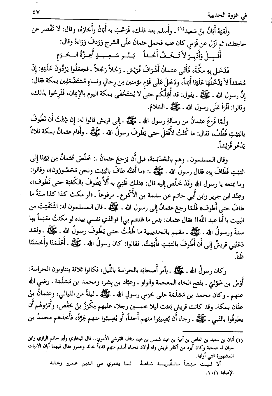 ولمّا فرغ عثمان من رسالة رسول الله- صلى الله عليه وسلم- إلى قريش قالوا له: إن شئت أن تطوف بالبيت فطف، فقال: ما كنت لأفعل حتى يطوف رسول الله- صلى الله عليه وسلم- وأقام عثمان بمكة ثلاثا يدعو قريشا.