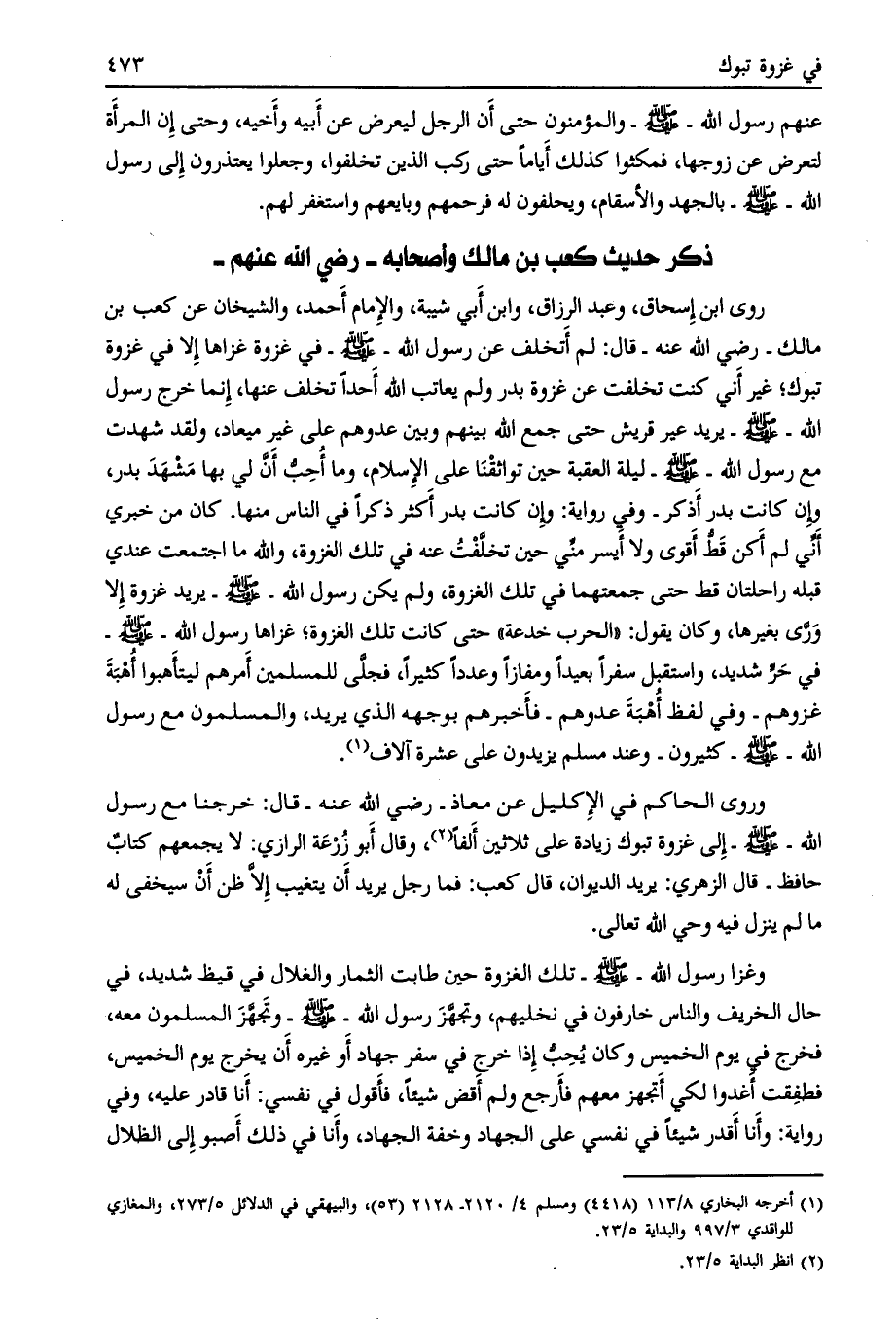 روى ابن إسحاق، وعبد الرزاق، وابن أبي شيبة، والإمام أحمد، والشيخان عن كعب بن مالك- رضي الله عنه- قال: لم أتخلف عن رسول الله- صلى الله عليه وسلم- في غزوة غزاها إلا في غزوة تبوك، غير أني كنت تخلفت عن غزوة بدر ولم يعاتب الله أحدا تخلف عنها، إنما خرج رسول الله- صلى الله عليه وسلّم- يريد عير قريش حتى جمع الله بينهم وبين عدوهم على غير ميعاد، ولقد شهدت مع رسول الله- صلى الله عليه وسلم- ليلة العقبة حين تواثقنا على الإسلام، وما أحبّ أنّ لي بها مشهد بدر، وإن كانت بدر أذكر- وفي رواية: وإن كانت بدر أكثر ذكرا في الناس منها. كان من خبري أني لم أكن قطّ أقوى ولا أيسر منّي حين تخلّفت عنه في تلك الغزوة، والله ما اجتمعت عندي قبله راحلتان قط حتى جمعتهما في تلك الغزوة، ولم يكن رسول الله- صلى الله عليه وسلم- يريد غزوة إلا ورّى بغيرها، وكان يقول: «الحرب خدعة» حتى كانت تلك الغزوة، غزاها رسول الله- صلى الله عليه وسلم- في حر شديد، واستقبل سفرا بعيدا ومفازا وعددا كثيرا، فجلّى للمسلمين أمرهم ليتأهبوا أهبة غزوهم- وفي لفظ أهبة عدوهم- فأخبرهم بوجهه الذي يريد، والمسلمون مع رسول الله- صلى الله عليه وسلّم- كثيرون- وعند مسلم يزيدون على عشرة آلاف [ (1) ] .