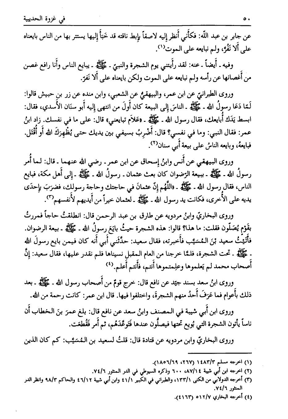 وفيه- أيضا- عنه: لقد رأيتني يوم الشجرة والنبي- صلى الله عليه وسلم- يبايع الناس وأنا رافع غصن من أغصانها عن رأسه ولم نبايعه على الموت ولكن بايعناه على ألا نفرّ.