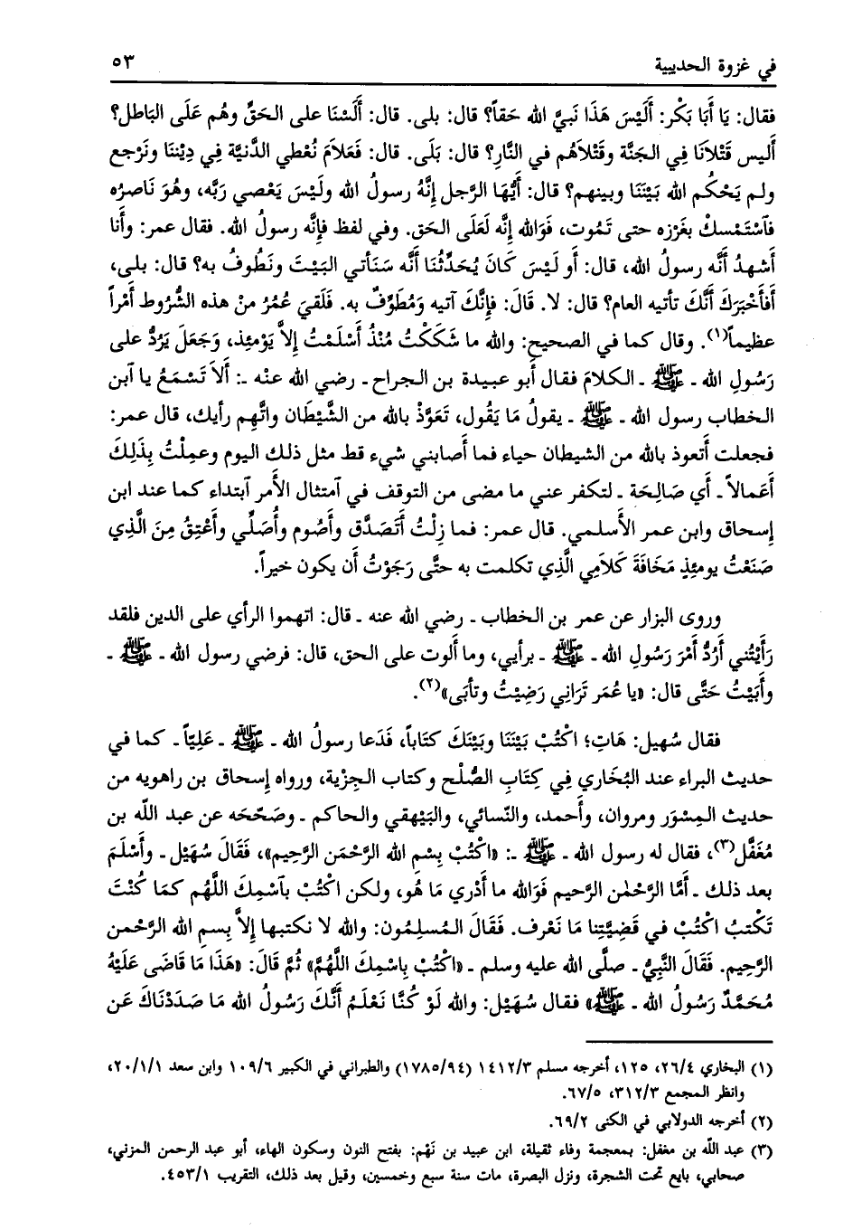 أليس قتلانا في الجنّة وقتلاهم في النار؟ قال: بلى. قال: فعلام نعطي الدّنيّة في ديننا ونرجع ولم يحكم الله بيننا وبينهم؟ قال: أيّها الرّجل أنه رسول الله وليس يعصي ربّه، وهو ناصره فاستمسك بغرزه حتى تموت، فو الله إنه لعلى الحق. وفي لفظ فإنّه رسول الله. فقال عمر: وأنا أشهد أنه رسول الله، قال: أو ليس كان يحدّثنا أنّه سنأتي البيت ونطوف به؟ قال: بلى، أفأخبرك أنّك تأتيه العام؟ قال: لا. قال: فإنّك آتيه ومطوّف به. فلقي عمر من هذه الشّروط أمرا عظيما [ (1) ] . وقال كما في الصحيح: والله ما شككت منذ أسلمت إلا يومئذ، وجعل يردّ على رسول الله- صلى الله عليه وسلّم- الكلام فقال أبو عبيدة بن الجراح- رضي الله عنه-: ألا تسمع يا ابن الخطاب رسول الله- صلى الله عليه وسلم- يقول ما يقول، تعوّذ بالله من الشّيطان واتّهم رأيك، قال عمر: