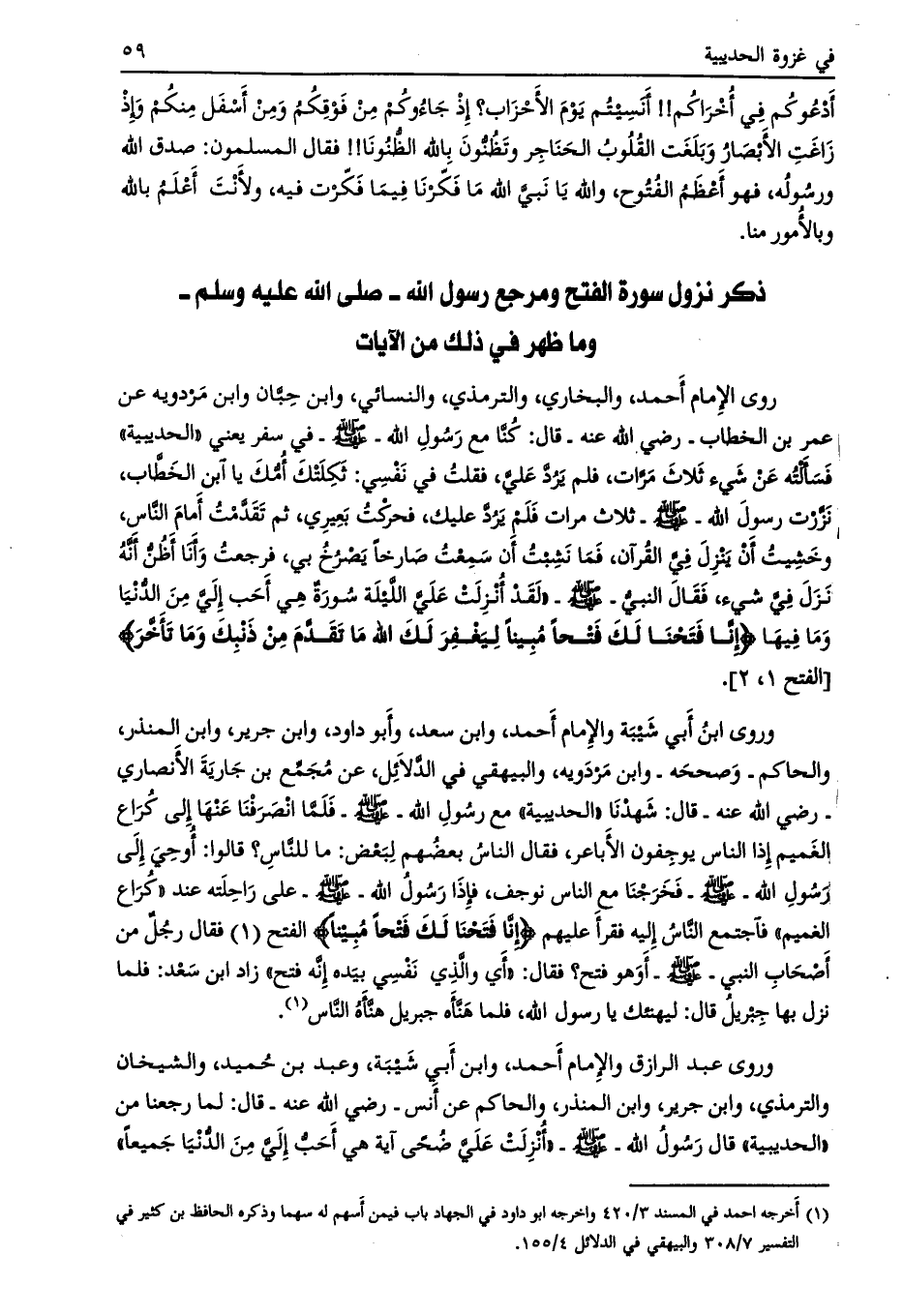 روى الإمام أحمد، والبخاري، والترمذي، والنسائي، وابن حبان وابن مردويه عن عمر بن الخطاب- رضي الله عنه- قال: كنا مع رسول الله- صلى الله عليه وسلم- في سفر يعني «الحديبيّة» فسألته عن شيء ثلاث مرّات، فلم يرد على، فقلت في نفسي: ثكلتك أمك يا ابن الخطّاب، نزّرت رسول الله- صلى الله عليه وسلم- ثلاث مرات فلم يردّ عليك، فحركت بعيري، ثم تقدّمت أمام النّاس، وخشيت أن ينزل فيّ القرآن، فما نشبت أن سمعت صارخا يصرخ بي، فرجعت وأنا أظنّ أنه نزل في شيء،
